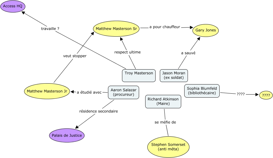 Cette carte de concepts créée avec IHMC CmapTools traite de: Accessville2, Sophia Blumfeld (bibliothécaire) ???? ????, Troy Masterson respect ultime Matthew Masterson Sr, Matthew Masterson Jr veut stopper Matthew Masterson Sr, Aaron Salazar (procureur) résidence secondaire Palais de Justice, Troy Masterson travaille ? Access HQ, Aaron Salazar (procureur) a étudié avec Matthew Masterson Jr, Jason Moran (ex soldat) a sauvé Gary Jones, Matthew Masterson Sr a pour chauffeur Gary Jones, Richard Atkinson (Maire) se méfie de Stephen Somerset (anti méta)