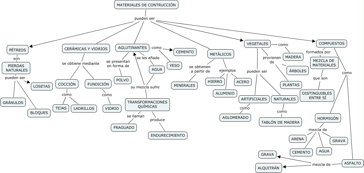 Este Cmap, tiene información relacionada con: materiales_construccion_alejandro, COMPUESTOS formados por MEZCLA DE MATERIALES, VEGETALES provienen de PLANTAS, AGLUTINANTES se presentan en forma de POLVO, MATERIALES DE CONTRUCCIÓN pueden ser METÁLICOS, NATURALES como TABLÓN DE MADERA, HORMIGÓN mezcla de ARENA, COCCIÓN como TEJAS, FUNDICIÓN como VIDRIO, HORMIGÓN mezcla de GRAVA, MATERIALES DE CONTRUCCIÓN pueden ser AGLUTINANTES, HORMIGÓN mezcla de AGUA, PIERDAS NATURALES pueden ser LOSETAS, MEZCLA DE MATERIALES que son DISTINGUIBLES ENTRE SÍ, MATERIALES DE CONTRUCCIÓN pueden ser PÉTREOS, ASFALTO mezcla de GRAVA, AGLUTINANTES se les añade AGUA, METÁLICOS ejemplos ACERO, VEGETALES como MADERA, CERÁMICAS Y VIDRIOS se obtiene mediante FUNDICIÓN, PIERDAS NATURALES pueden ser BLOQUES