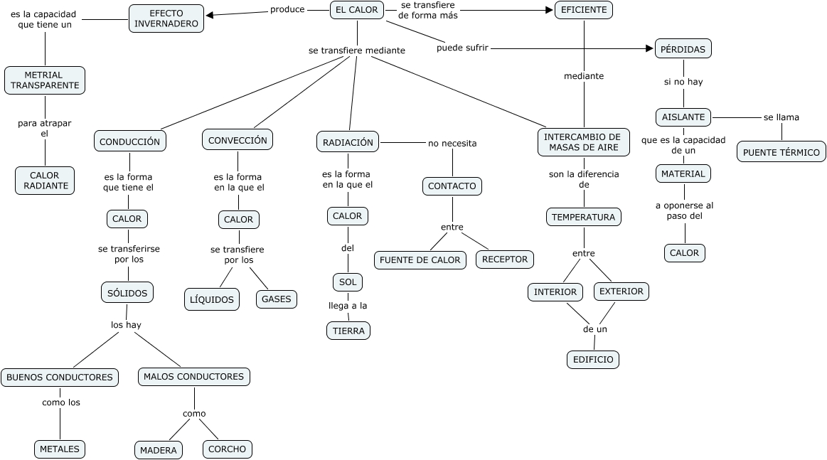 Este Cmap, tiene información relacionada con: calor_alejandro, RADIACIÓN no necesita CONTACTO, SÓLIDOS los hay MALOS CONDUCTORES, CONDUCCIÓN es la forma que tiene el CALOR, AISLANTE que es la capacidad de un MATERIAL, RADIACIÓN es la forma en la que el CALOR, EFECTO INVERNADERO es la capacidad que tiene un METRIAL TRANSPARENTE, CONVECCIÓN es la forma en la que el CALOR, EFICIENTE mediante INTERCAMBIO DE MASAS DE AIRE, MALOS CONDUCTORES como CORCHO, EL CALOR puede sufrir PÉRDIDAS, TEMPERATURA entre EXTERIOR, MALOS CONDUCTORES como MADERA, AISLANTE se llama PUENTE TÉRMICO, EL CALOR produce EFECTO INVERNADERO, EL CALOR se transfiere mediante RADIACIÓN, CONTACTO entre RECEPTOR, BUENOS CONDUCTORES como los METALES, EL CALOR se transfiere mediante INTERCAMBIO DE MASAS DE AIRE, CONTACTO entre FUENTE DE CALOR, CALOR se transfiere por los LÍQUIDOS