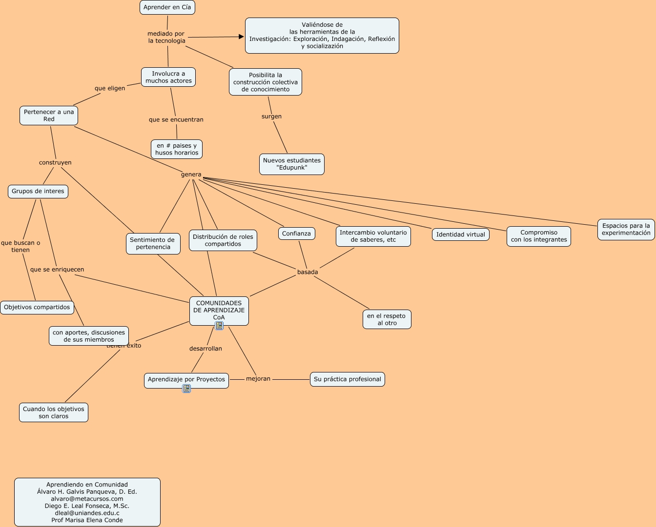 Este Cmap, tiene información relacionada con: Aprendiendo en comunidad, Grupos de interes que se enriquecen COMUNIDADES DE APRENDIZAJE CoA, COMUNIDADES DE APRENDIZAJE CoA tienen éxito Cuando los objetivos son claros, Pertenecer a una Red genera COMUNIDADES DE APRENDIZAJE CoA, Involucra a muchos actores que se encuentran en # paises y husos horarios, Pertenecer a una Red genera Espacios para la experimentación, Pertenecer a una Red genera Distribución de roles compartidos, Pertenecer a una Red construyen COMUNIDADES DE APRENDIZAJE CoA, Pertenecer a una Red construyen Grupos de interes, Distribución de roles compartidos basada en el respeto al otro, Aprendizaje por Proyectos mejoran Su práctica profesional, Pertenecer a una Red genera Confianza, Pertenecer a una Red genera Compromiso con los integrantes, Posibilita la construcción colectiva de conocimiento surgen Nuevos estudiantes "Edupunk", Involucra a muchos actores que eligen Pertenecer a una Red, Confianza basada en el respeto al otro, COMUNIDADES DE APRENDIZAJE CoA basada en el respeto al otro, Pertenecer a una Red genera Sentimiento de pertenencia, Pertenecer a una Red genera Identidad virtual, Intercambio voluntario de saberes, etc basada en el respeto al otro, Grupos de interes que se enriquecen con aportes, discusiones de sus miembros