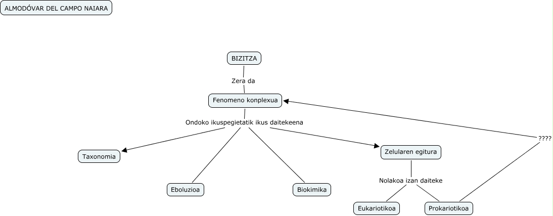 Este Cmap, tiene información relacionada con: Almodóvar del Campo Naiara, Fenomeno konplexua Ondoko ikuspegietatik ikus daitekeena Zelularen egitura, Fenomeno konplexua Ondoko ikuspegietatik ikus daitekeena Biokimika, BIZITZA Zera da Fenomeno konplexua, Zelularen egitura Nolakoa izan daiteke Eukariotikoa, Fenomeno konplexua Ondoko ikuspegietatik ikus daitekeena Taxonomia, Zelularen egitura Nolakoa izan daiteke Prokariotikoa, Fenomeno konplexua Ondoko ikuspegietatik ikus daitekeena Eboluzioa, Prokariotikoa ???? Fenomeno konplexua