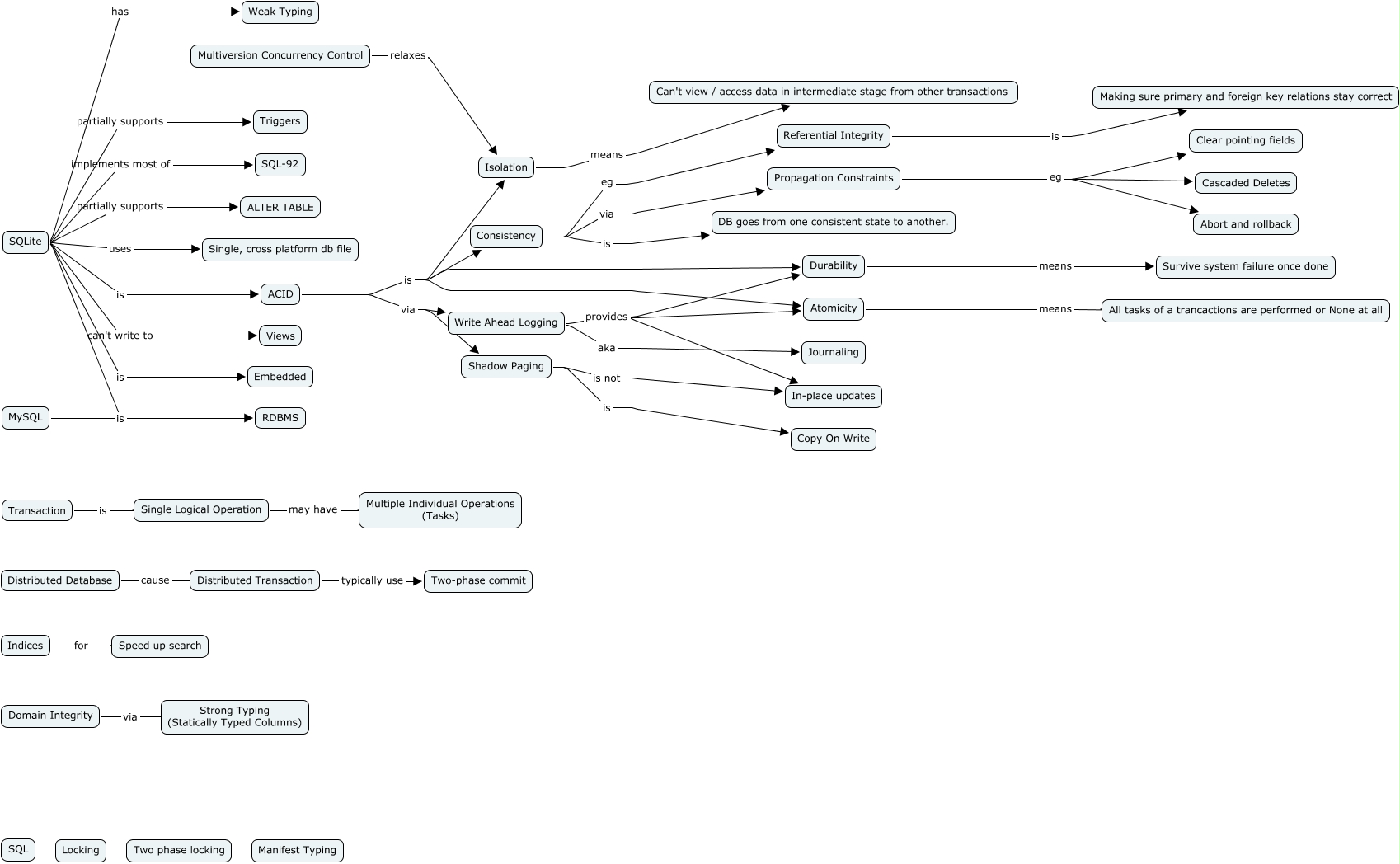 This Concept Map, created with IHMC CmapTools, has information related to: SQL, ACID via Shadow Paging, MySQL is RDBMS, Write Ahead Logging provides In-place updates, Propagation Constraints eg Clear pointing fields, Consistency eg Referential Integrity, Distributed Transaction typically use Two-phase commit, SQLite has Weak Typing, SQLite uses Single, cross platform db file, Shadow Paging is Copy On Write, SQLite partially supports Triggers, SQLite implements most of SQL-92, Isolation means Can't view / access data in intermediate stage from other transactions, Consistency is DB goes from one consistent state to another., Atomicity means All tasks of a trancactions are performed or None at all, Multiversion Concurrency Control relaxes Isolation, Transaction is Single Logical Operation, Single Logical Operation may have Multiple Individual Operations (Tasks), SQLite can't write to Views, ACID is Consistency, ACID is Durability