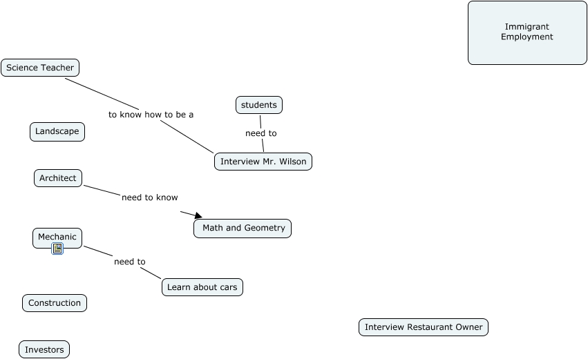 This Concept Map, created with IHMC CmapTools, has information related to: Immigrant Jobs-7th bell, Science Teacher to know how to be a Interview Mr. Wilson, students need to Interview Mr. Wilson, Mechanic need to Learn about cars, Architect need to know Math and Geometry