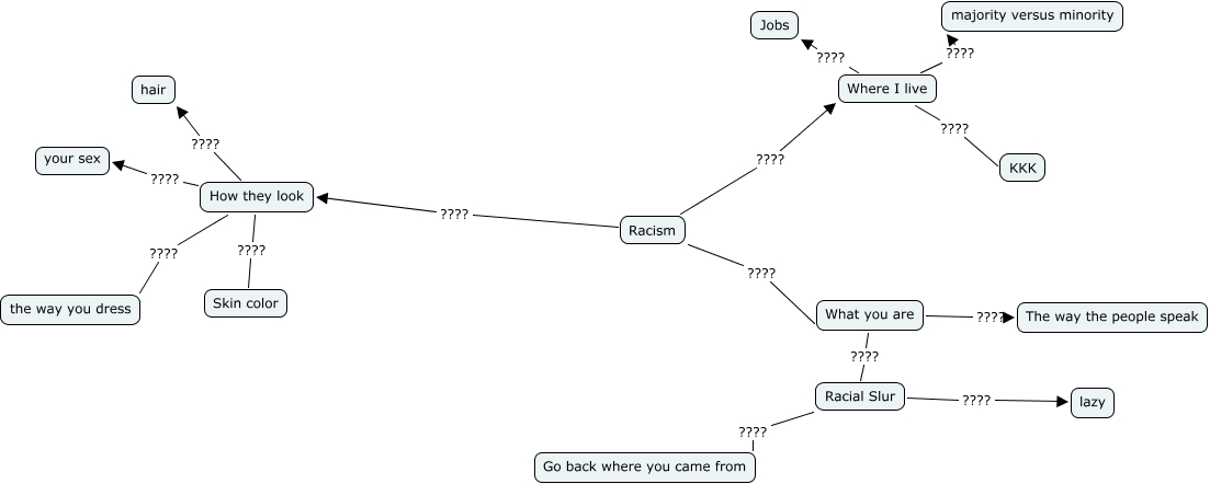 This Concept Map, created with IHMC CmapTools, has information related to: Racism, Racism ???? How they look, How they look ???? hair, How they look ???? Skin color, Where I live ???? KKK, Racial Slur ???? Go back where you came from, What you are ???? Racial Slur, Racial Slur ???? lazy, Where I live ???? Jobs, How they look ???? the way you dress, How they look ???? your sex, Racism ???? What you are, Where I live ???? majority versus minority, What you are ???? The way the people speak, Racism ???? Where I live