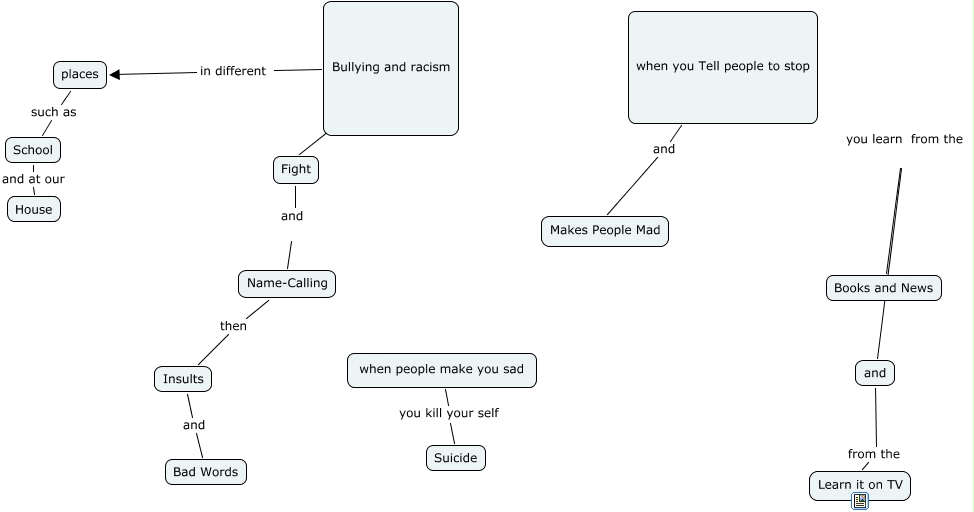 This Concept Map, created with IHMC CmapTools, has information related to: Bullying-4th Bell 2, Fight and Name-Calling, when you Tell people to stop and Makes People Mad, places such as School, and from the Learn it on TV, when people make you sad you kill your self Suicide, Name-Calling then Insults, Insults and Bad Words, Bullying and racism ???? Fight, School and at our House, Bullying and racism in different places, Books and News you learn from the and