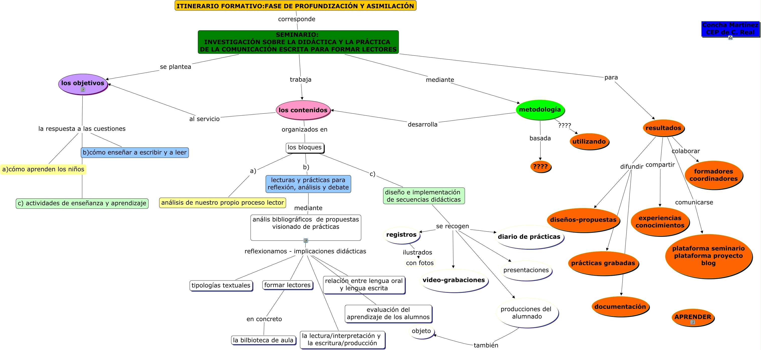 Este Cmap, tiene información relacionada con: 5.4.-presentación_completa_seminario, los objetivos la respuesta a las cuestiones c) actividades de enseñanza y aprendizaje, metodología desarrolla los contenidos, resultados colaborar formadores coordinadores, los objetivos la respuesta a las cuestiones b)cómo enseñar a escribir y a leer, resultados difundir documentación, los bloques c) diseño e implementación de secuencias didácticas, anális bibliográficos de propuestas visionado de prácticas reflexionamos - implicaciones didácticas evaluación del aprendizaje de los alumnos, formar lectores en concreto la bilbioteca de aula, diseño e implementación de secuencias didácticas se recogen producciones del alumnado, los bloques a) análisis de nuestro propio proceso lector, lecturas y prácticas para reflexión, análisis y debate mediante anális bibliográficos de propuestas visionado de prácticas, resultados comunicarse plataforma seminario plataforma proyecto blog, SEMINARIO: INVESTIGACIÓN SOBRE LA DIDÁCTICA Y LA PRÁCTICA DE LA COMUNICACIÓN ESCRITA PARA FORMAR LECTORES trabaja los contenidos, los contenidos al servicio los objetivos, SEMINARIO: INVESTIGACIÓN SOBRE LA DIDÁCTICA Y LA PRÁCTICA DE LA COMUNICACIÓN ESCRITA PARA FORMAR LECTORES para resultados, anális bibliográficos de propuestas visionado de prácticas reflexionamos - implicaciones didácticas tipologías textuales, anális bibliográficos de propuestas visionado de prácticas reflexionamos - implicaciones didácticas relación entre lengua oral y lengua escrita, SEMINARIO: INVESTIGACIÓN SOBRE LA DIDÁCTICA Y LA PRÁCTICA DE LA COMUNICACIÓN ESCRITA PARA FORMAR LECTORES mediante metodología, ITINERARIO FORMATIVO:FASE DE PROFUNDIZACIÓN Y ASIMILACIÓN corresponde SEMINARIO: INVESTIGACIÓN SOBRE LA DIDÁCTICA Y LA PRÁCTICA DE LA COMUNICACIÓN ESCRITA PARA FORMAR LECTORES, resultados difundir diseños-propuestas