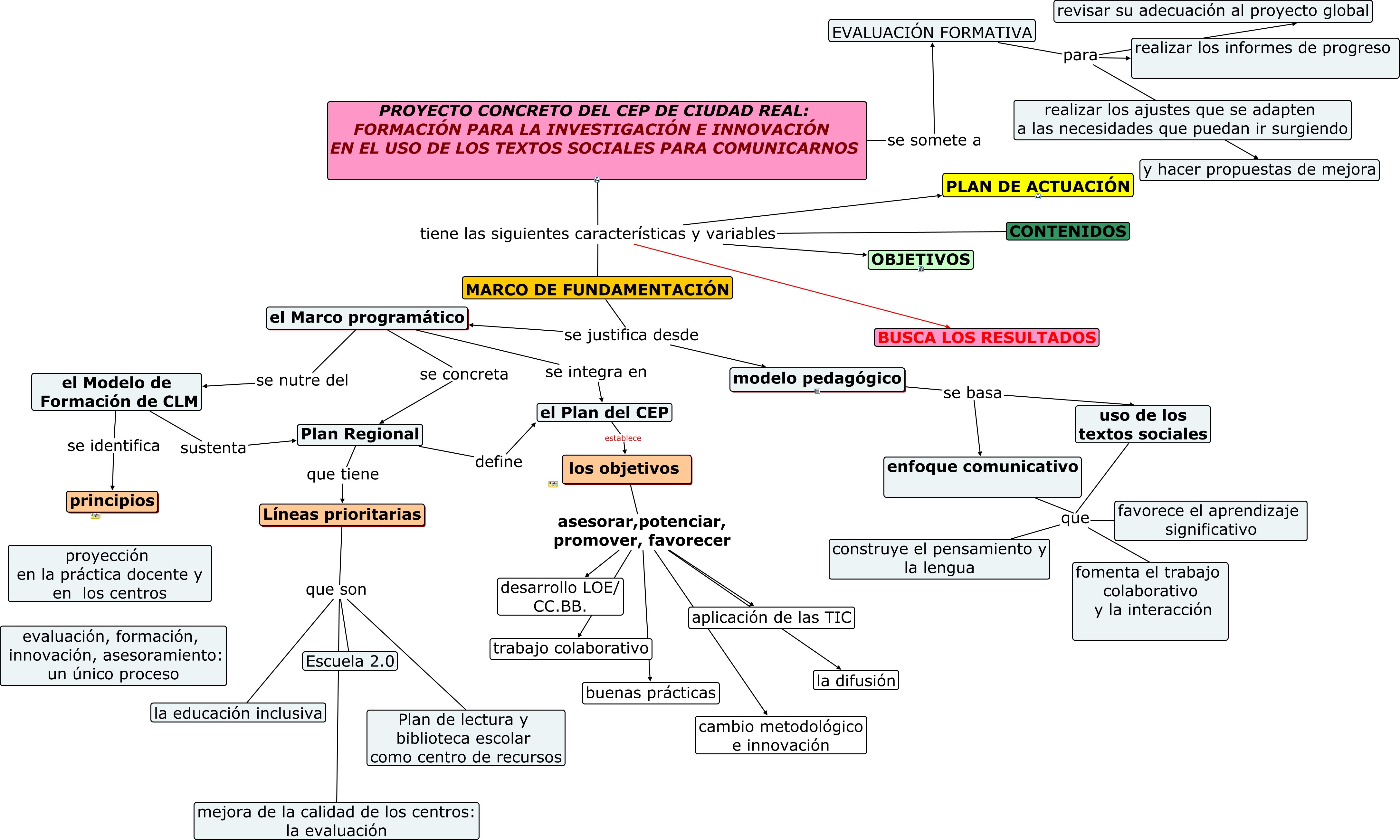 Este Cmap, tiene información relacionada con: 3.1.presentacion_proyecto_singular_cepCReal, EVALUACIÓN FORMATIVA para realizar los informes de progreso, modelo pedagógico se basa enfoque comunicativo, el Modelo de Formación de CLM sustenta Plan Regional, el Modelo de Formación de CLM se identifica principios, uso de los textos sociales que construye el pensamiento y la lengua, los objetivos asesorar,potenciar, promover, favorecer desarrollo LOE/ CC.BB., uso de los textos sociales que fomenta el trabajo colaborativo y la interacción, Plan Regional que tiene Líneas prioritarias, los objetivos asesorar,potenciar, promover, favorecer buenas prácticas, Líneas prioritarias que son la educación inclusiva, PROYECTO CONCRETO DEL CEP DE CIUDAD REAL: FORMACIÓN PARA LA INVESTIGACIÓN E INNOVACIÓN EN EL USO DE LOS TEXTOS SOCIALES PARA COMUNICARNOS tiene las siguientes características y variables PLAN DE ACTUACIÓN, PROYECTO CONCRETO DEL CEP DE CIUDAD REAL: FORMACIÓN PARA LA INVESTIGACIÓN E INNOVACIÓN EN EL USO DE LOS TEXTOS SOCIALES PARA COMUNICARNOS tiene las siguientes características y variables BUSCA LOS RESULTADOS, los objetivos asesorar,potenciar, promover, favorecer trabajo colaborativo, MARCO DE FUNDAMENTACIÓN se justifica desde el Marco programático, el Marco programático se concreta Plan Regional, modelo pedagógico se basa uso de los textos sociales, los objetivos asesorar,potenciar, promover, favorecer cambio metodológico e innovación, Líneas prioritarias que son Plan de lectura y biblioteca escolar como centro de recursos, Líneas prioritarias que son mejora de la calidad de los centros: la evaluación, el Marco programático se nutre del el Modelo de Formación de CLM