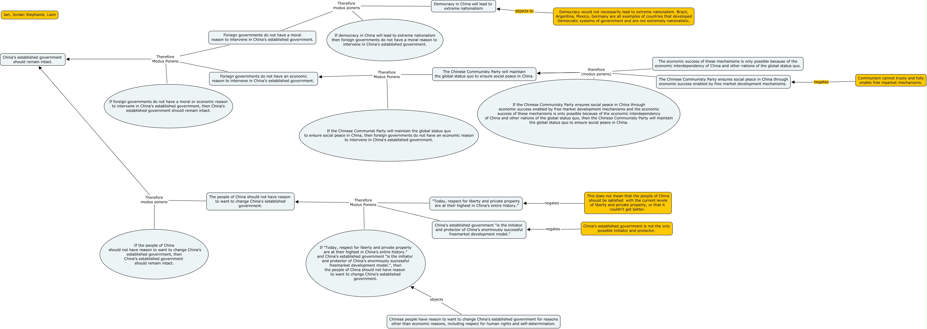 This Concept Map, created with IHMC CmapTools, has information related to: China argument 1st draft, The Chinese Communisty Party ensures social peace in China through economic success enabled by free market development mechanisms. therefore (modus ponens) The Chinese Communisty Party will maintain the global status quo to ensure social peace in China., Chinese people have reason to want to change China's established government for reasons other than economic reasons, including respect for human rights and self-determination. objects If "Today, respect for liberty and private property are at their highest in China’s entire history." and China's established government "is the initiator and protector of China’s enormously successful freemarket development model.", then the people of China should not have reason to want to change China's established government., The Chinese Communisty Party will maintain the global status quo to ensure social peace in China. Therefore Modus Ponens Foriegn governments do not have an economic reason to intervene in China's established government., Democracy in China will lead to extreme nationalisim Therefore modus ponens Foriegn governments do not have a moral reason to intervene in China's established government., If the Chinese Communisty Party ensures social peace in China through economic success enabled by free market development mechanisms and the economic success of these mechanisms is only possible because of the economic interdependency of China and other nations of the global status quo, then the Chinese Communisty Party will maintain the global status quo to ensure social peace in China. therefore (modus ponens) The Chinese Communisty Party will maintain the global status quo to ensure social peace in China., Democracy in China will lead to extreme nationalisim Therefore modus ponens If democracy in China will lead to extreme nationalism then foriegn governments do not have a moral reason to intervene in China's established government., Communism cannot truely and fully enable free maarket mechanisms. negates The Chinese Communisty Party ensures social peace in China through economic success enabled by free market development mechanisms., If the Chinese Communisty Party ensures social peace in China through economic success enabled by free market development mechanisms and the economic success of these mechanisms is only possible because of the economic interdependency of China and other nations of the global status quo, then the Chinese Communisty Party will maintain the global status quo to ensure social peace in China. therefore (modus ponens) The Chinese Communisty Party will maintain the global status quo to ensure social peace in China., If the Chinese Communist Party will maintain the global status quo to ensure social peace in China, then foreign governments do not have an economic reason to intervene in China's established government. Therefore Modus Ponens Foriegn governments do not have an economic reason to intervene in China's established government., Democracy would not necessarily lead to extreme nationalism. Brazil, Argentina, Mexico, Germany are all examples of countries that developed Democratic systems of government and are not extremely nationalistic. objects to Democracy in China will lead to extreme nationalisim, The people of China should not have reason to want to change China's established government. Therefore modus ponens China's established government should remain intact., This does not mean that the people of China should be satisfied with the current levels of liberty and private property, or that it couldn't get better. negates "Today, respect for liberty and private property are at their highest in China’s entire history.", "Today, respect for liberty and private property are at their highest in China’s entire history." Therefore Modus Ponens The people of China should not have reason to want to change China's established government., The economic success of these mechanisms is only possible because of the economic interdependency of China and other nations of the global status quo. therefore (modus ponens) The Chinese Communisty Party will maintain the global status quo to ensure social peace in China., If "Today, respect for liberty and private property are at their highest in China’s entire history." and China's established government "is the initiator and protector of China’s enormously successful freemarket development model.", then the people of China should not have reason to want to change China's established government. Therefore Modus Ponens The people of China should not have reason to want to change China's established government., China's established government "is the initiator and protector of China’s enormously successful freemarket development model." Therefore Modus Ponens The people of China should not have reason to want to change China's established government., The people of China should not have reason to want to change China's established government. Therefore modus ponens If the people of China should not have reason to want to change China's established government, then China's established government should remain intact., Foriegn governments do not have a moral reason to intervene in China's established government. Therefore Modus Ponens China's established government should remain intact., Foriegn governments do not have an economic reason to intervene in China's established government. Therefore Modus Ponens China's established government should remain intact., China's established government is not the only possible initiator and protector. negates China's established government "is the initiator and protector of China’s enormously successful freemarket development model."