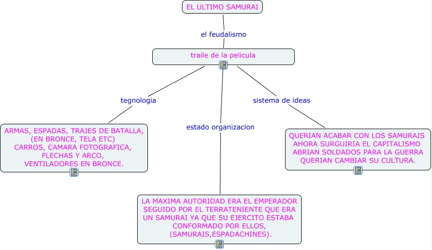 This Concept Map, created with IHMC CmapTools, has information related to: EL ULTIMO SAMURAI ( MAPA CONCEPTUAL), EL ULTIMO SAMURAI el feudalismo traile de la pelicula, traile de la pelicula tegnologia ARMAS, ESPADAS, TRAJES DE BATALLA, (EN BRONCE, TELA ETC) CARROS, CAMARA FOTOGRAFICA, FLECHAS Y ARCO, VENTILADORES EN BRONCE., traile de la pelicula sistema de ideas QUERIAN ACABAR CON LOS SAMURAIS AHORA SURGUIRIA EL CAPITALISMO ABRIAN SOLDADOS PARA LA GUERRA QUERIAN CAMBIAR SU CULTURA., traile de la pelicula estado organizacion LA MAXIMA AUTORIDAD ERA EL EMPERADOR SEGUIDO POR EL TERRATENIENTE QUE ERA UN SAMURAI YA QUE SU EJERCITO ESTABA CONFORMADO POR ELLOS, (SAMURAIS,ESPADACHINES).
