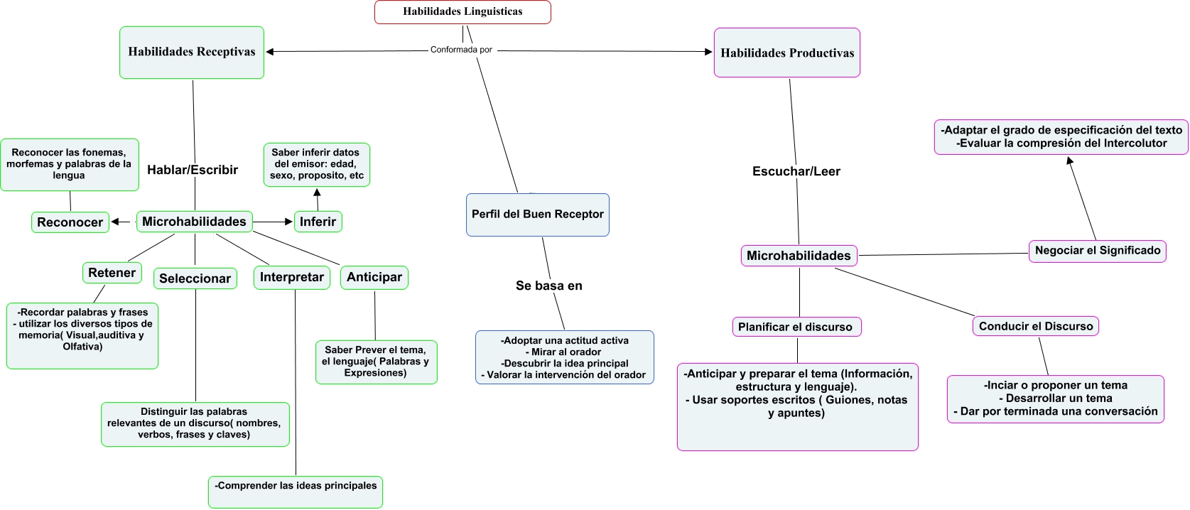Este Cmap, tiene información relacionada con: Indira, Negociar el Significado -Adaptar el grado de especificación del texto -Evaluar la compresión del Intercolutor, Habilidades Linguisticas Perfil del Buen Receptor, Microhabilidades Negociar el Significado, Habilidades Linguisticas Conformada por Habilidades Receptivas, Conducir el Discurso -Inciar o proponer un tema - Desarrollar un tema - Dar por terminada una conversación, Microhabilidades Planificar el discurso, Microhabilidades Seleccionar, Anticipar Saber Prever el tema, el lenguaje( Palabras y Expresiones), Microhabilidades Anticipar, Microhabilidades Interpretar, Microhabilidades Reconocer, Microhabilidades Conducir el Discurso, Perfil del Buen Receptor Se basa en -Adoptar una actitud activa - Mirar al orador -Descubrir la idea principal - Valorar la intervención del orador, Habilidades Receptivas Hablar/Escribir Microhabilidades, Inferir Saber inferir datos del emisor: edad, sexo, proposito, etc, Microhabilidades Retener, Habilidades Linguisticas Conformada por Habilidades Productivas, Seleccionar Distinguir las palabras relevantes de un discurso( nombres, verbos, frases y claves), Habilidades Productivas Escuchar/Leer Microhabilidades, Planificar el discurso -Anticipar y preparar el tema (Información, estructura y lenguaje). - Usar soportes escritos ( Guiones, notas y apuntes)