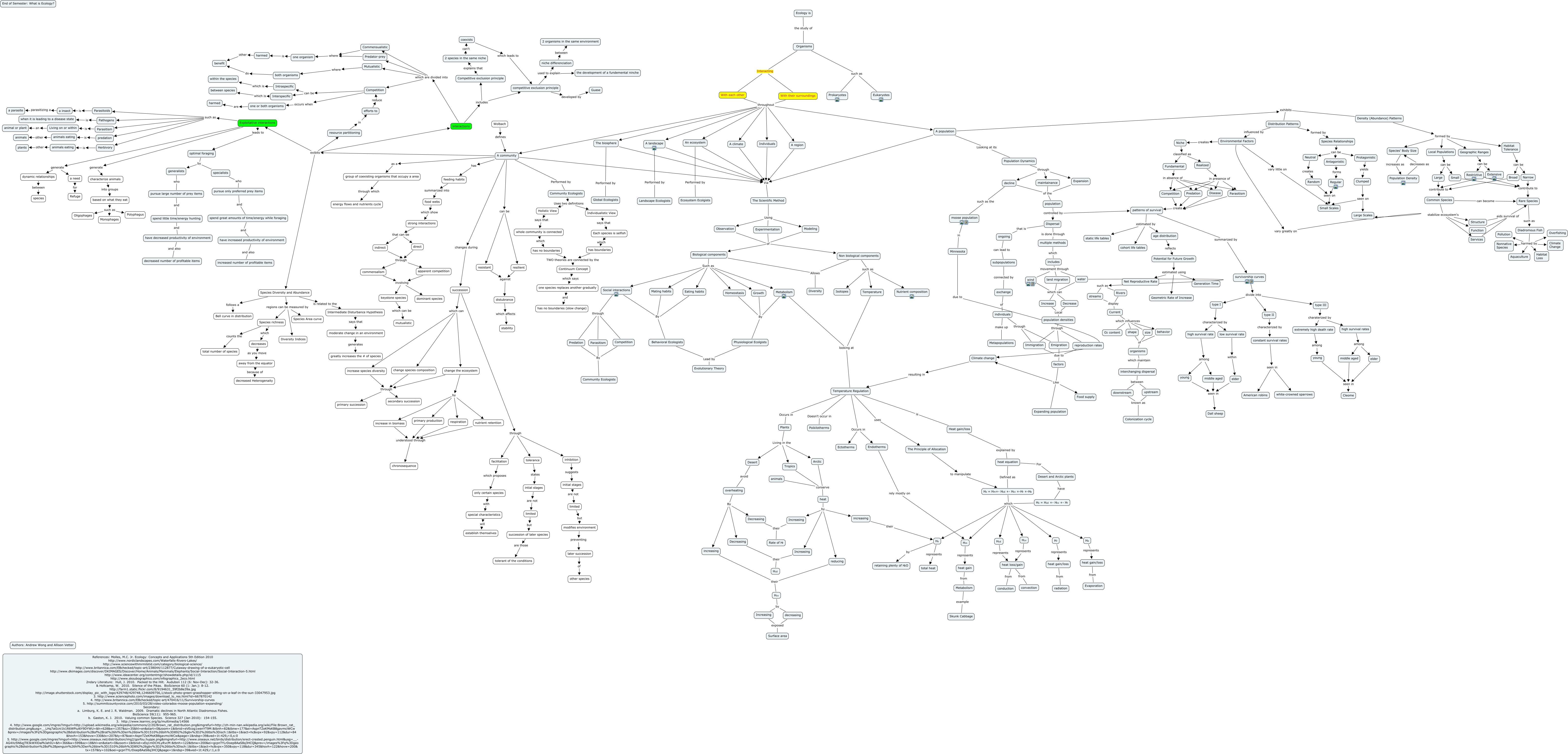 This Concept Map, created with IHMC CmapTools, has information related to: AV AW final What is Ecology, Social interactions By Behavioral Ecologists, optimal foraging by specialists, interchanging dispersal between upstream, niche differenciation between 2 organisms in the same environment, constant survival rates seen in white-crowned sparrows, indirect through apparent competition, A population Looking at its Population Dynamics, elder seen in Cleome, water such as Rivers, Rivers display Current, efforts to reduce Competition, Hm represents heat gain, a insect parasitizing a a parasite, increase species diversity through secondary succession, An ecosystem Performed by Ecosystem Ecolgists, one species replaces another gradually and has no boundaries (slow change), Competition occurs when one or both organisms, young seen in Dall sheep, has no boundaries TWO theories are connected by the Continuum Concept, A community exibits Exploitative interactions