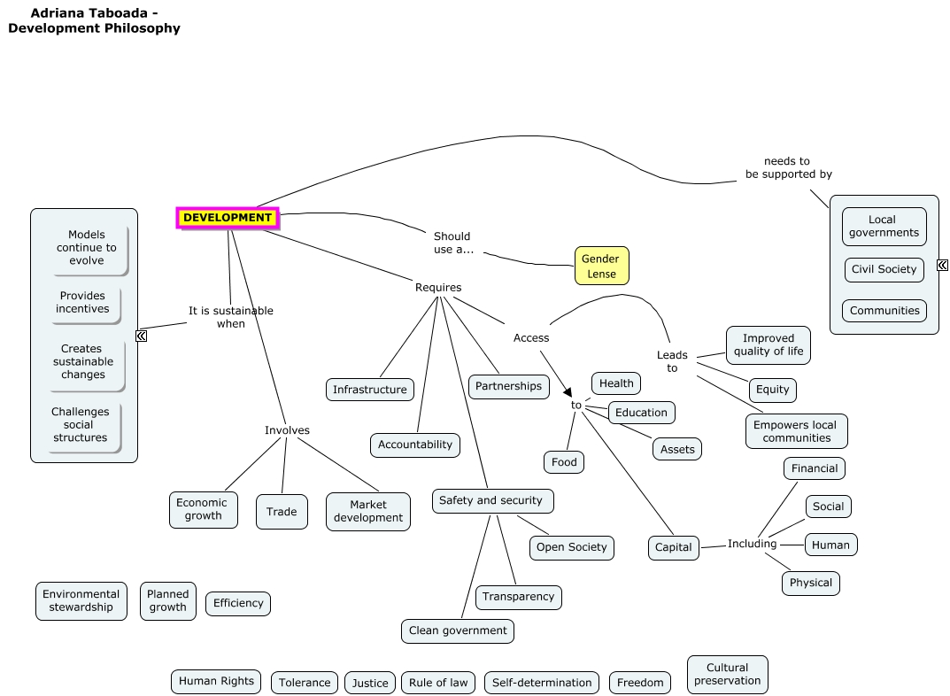 This Concept Map, created with IHMC CmapTools, has information related to: Adriana Taboada - my dev. philosophy, Access to Education, Safety and security Clean government, Capital Including Social, Capital Including Human, Capital Including Physical, DEVELOPMENT Requires Accountability, ???? needs to be supported by, Leads to Improved quality of life, Safety and security Transparency, DEVELOPMENT Involves Economic growth, DEVELOPMENT Requires Safety and security, DEVELOPMENT Requires Partnerships, Equity Leads to, DEVELOPMENT Should use a..., DEVELOPMENT Involves Market development, Infrastructure Requires Partnerships, DEVELOPMENT needs to be supported by, Infrastructure Requires Access, Access to Assets, Leads to Empowers local communities