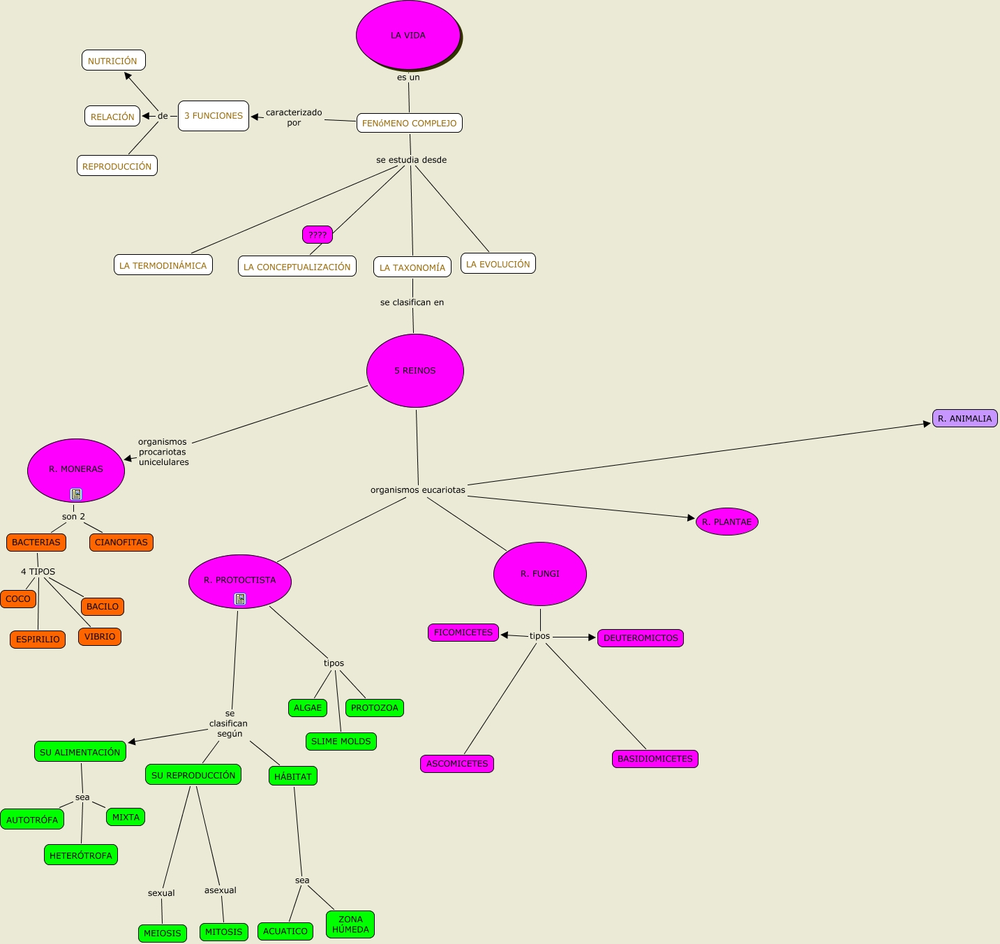 Este Cmap, tiene información relacionada con: LA VIDA, R. PROTOCTISTA tipos PROTOZOA, LA VIDA es un FENóMENO COMPLEJO, BACTERIAS 4 TIPOS ESPIRILIO, 3 FUNCIONES de NUTRICIÓN, 5 REINOS organismos procariotas unicelulares R. MONERAS, SU ALIMENTACIÓN sea MIXTA, BACTERIAS 4 TIPOS VIBRIO, FENóMENO COMPLEJO se estudia desde LA TAXONOMÍA, 5 REINOS organismos eucariotas R. PROTOCTISTA, R. FUNGI tipos ASCOMICETES, R. MONERAS son 2 BACTERIAS, R. MONERAS son 2 CIANOFITAS, R. FUNGI tipos DEUTEROMICTOS, BACTERIAS 4 TIPOS BACILO, 5 REINOS organismos eucariotas R. PLANTAE, HÁBITAT sea ZONA HÚMEDA, R. PROTOCTISTA se clasifican según SU ALIMENTACIÓN, R. FUNGI tipos FICOMICETES, R. PROTOCTISTA tipos SLIME MOLDS, 3 FUNCIONES de RELACIÓN