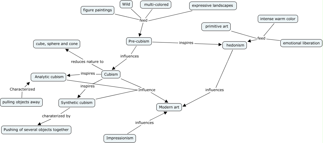 This Concept Map, created with IHMC CmapTools, has information related to: bestever, Pre-cubism inspires hedonism, Analytic cubism Influence Modern art, multi-colored feed Pre-cubism, Cubism Influence Modern art, figure paintings feed Pre-cubism, pulling objects away Characterized Analytic cubism, intense warm color feed hedonism, Impressionism influences Modern art, Synthetic cubism charaterized by Pushing of several objects together, emotional liberation feed hedonism, Cubism inspires Synthetic cubism, Cubism reduces nature to cube, sphere and cone, Pre-cubism influences Cubism, expressive landscapes feed Pre-cubism, hedonism influences Modern art, Synthetic cubism Influence Modern art, Cubism inspires Analytic cubism, primitive art feed hedonism, Wild feed Pre-cubism