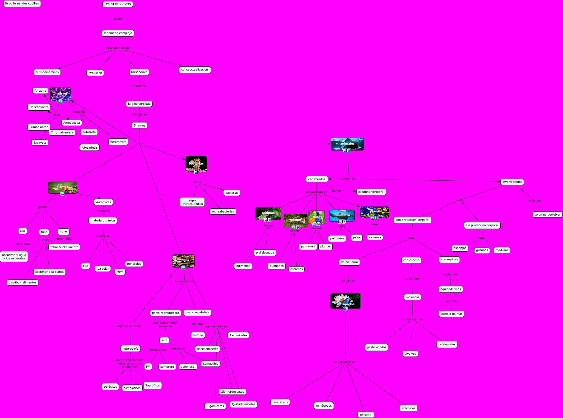 Este Cmap, tiene información relacionada con: iñigo_Fernandez_Cubillas_Primer_trabajo, vertebrados se clasifican en aves, moluscos se clasifican en bivalvos, artrópodos se clasifican en miriápodos, hongos tipo de nutrición heterótrofa, heterótrofa por su relación con otros seres vivos pueden ser parásitos, seta formada por sombrero, moluscos se clasifican en cefalópodos, protistos nutrición autótrofa, con proteccion corporal tipos de piel dura, sin protección corporal tipos medusas, con proteccion corporal tipos con espinas, artrópodos se clasifican en insectos, fenomeno complejo estudiable desde concepctualizacion, tarsonomia se ordena la biodiversidad, seta puede ser venenosa, materia orgánica apartir de minerales, plantas partes tallo, fenomeno complejo estudiable desde tarsonomia, invertebrados tipos sin protección corporal, animales pueden ser invertebrados