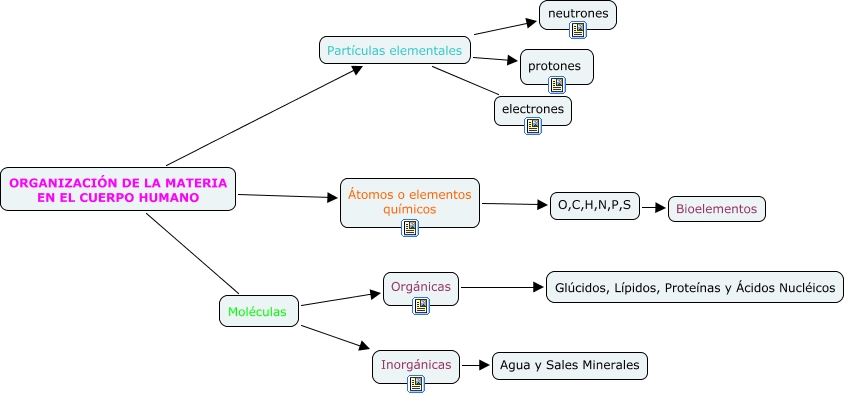 Este Cmap, tiene información relacionada con: Esquema de biologia, Partículas elementales electrones, O,C,H,N,P,S Bioelementos, Moléculas Inorgánicas, Partículas elementales neutrones, Orgánicas Glúcidos, Lípidos, Proteínas y Ácidos Nucléicos, ORGANIZACIÓN DE LA MATERIA EN EL CUERPO HUMANO Átomos o elementos químicos, ORGANIZACIÓN DE LA MATERIA EN EL CUERPO HUMANO Moléculas, Inorgánicas Agua y Sales Minerales, ORGANIZACIÓN DE LA MATERIA EN EL CUERPO HUMANO Partículas elementales, Átomos o elementos químicos O,C,H,N,P,S, Partículas elementales protones, Moléculas Orgánicas