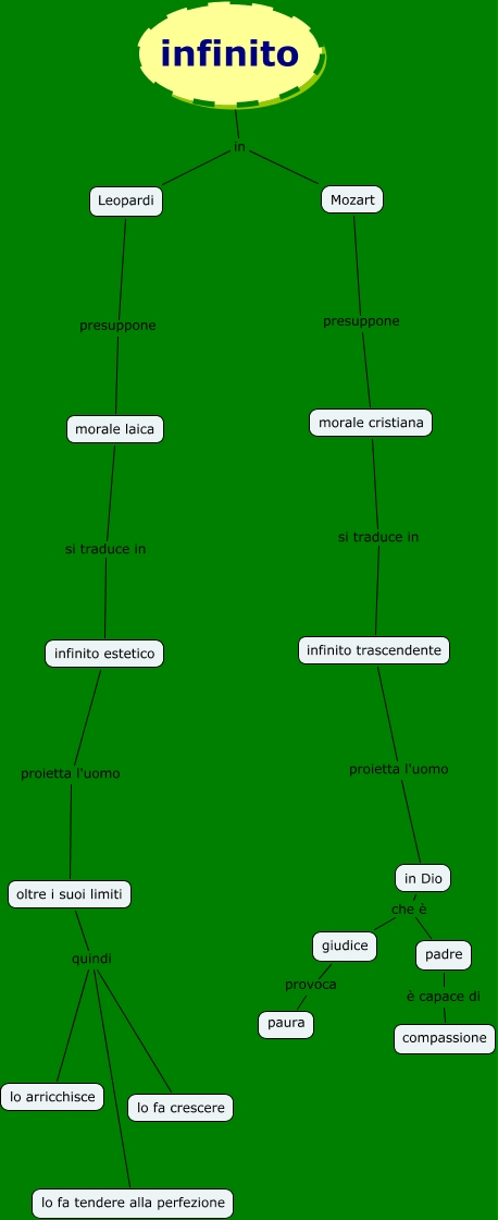 Questa Cmap, creata con IHMC CmapTools, contiene informazioni relative a: infinito, padre è capace di compassione, oltre i suoi limiti quindi lo fa crescere, oltre i suoi limiti quindi lo fa tendere alla perfezione, giudice provoca paura, Leopardi presuppone morale laica, infinito in Leopardi, infinito estetico proietta l'uomo oltre i suoi limiti, infinito trascendente proietta l'uomo in Dio, Mozart presuppone morale cristiana, in Dio che è giudice, oltre i suoi limiti quindi lo arricchisce, infinito in Mozart, morale laica si traduce in infinito estetico, in Dio che è padre, morale cristiana si traduce in infinito trascendente