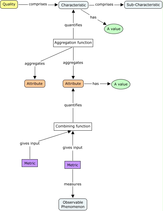 Este Cmap, tiene información relacionada con: Quality Attribute Metric, Attribute has A value, Characteristic comprises Sub-Characteristic, Aggregation function aggregates Attribute, Metric gives input Combining function, Aggregation function quantifies Characteristic, Metric gives input Combining function, Combining function quantifies Attribute, Metric measures Observable Phenomenon, Aggregation function aggregates Attribute, Quality comprises Characteristic, Characteristic has A value