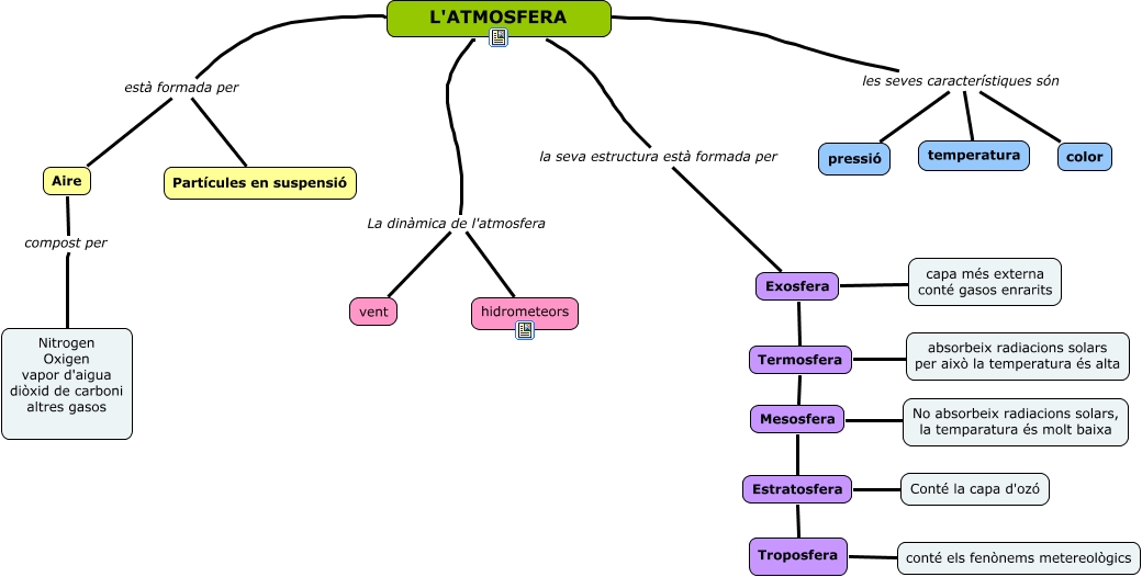 Aquest mapa conceptual conté informació relacionada amb: L'atmosfera, L'ATMOSFERA les seves característiques són color, L'ATMOSFERA les seves característiques són temperatura, Troposfera conté els fenònems metereològics, L'ATMOSFERA les seves característiques són pressió, L'ATMOSFERA la seva estructura està formada per Exosfera, Estratosfera Troposfera, Mesosfera Estratosfera, L'ATMOSFERA La dinàmica de l'atmosfera vent, Termosfera absorbeix radiacions solars per això la temperatura és alta, L'ATMOSFERA està formada per Aire, Estratosfera Conté la capa d'ozó, L'ATMOSFERA està formada per Partícules en suspensió, Termosfera Mesosfera, Exosfera Termosfera, L'ATMOSFERA La dinàmica de l'atmosfera hidrometeors, Exosfera capa més externa conté gasos enrarits, Aire compost per Nitrogen Oxigen vapor d'aigua diòxid de carboni altres gasos, Mesosfera No absorbeix radiacions solars, la temparatura és molt baixa