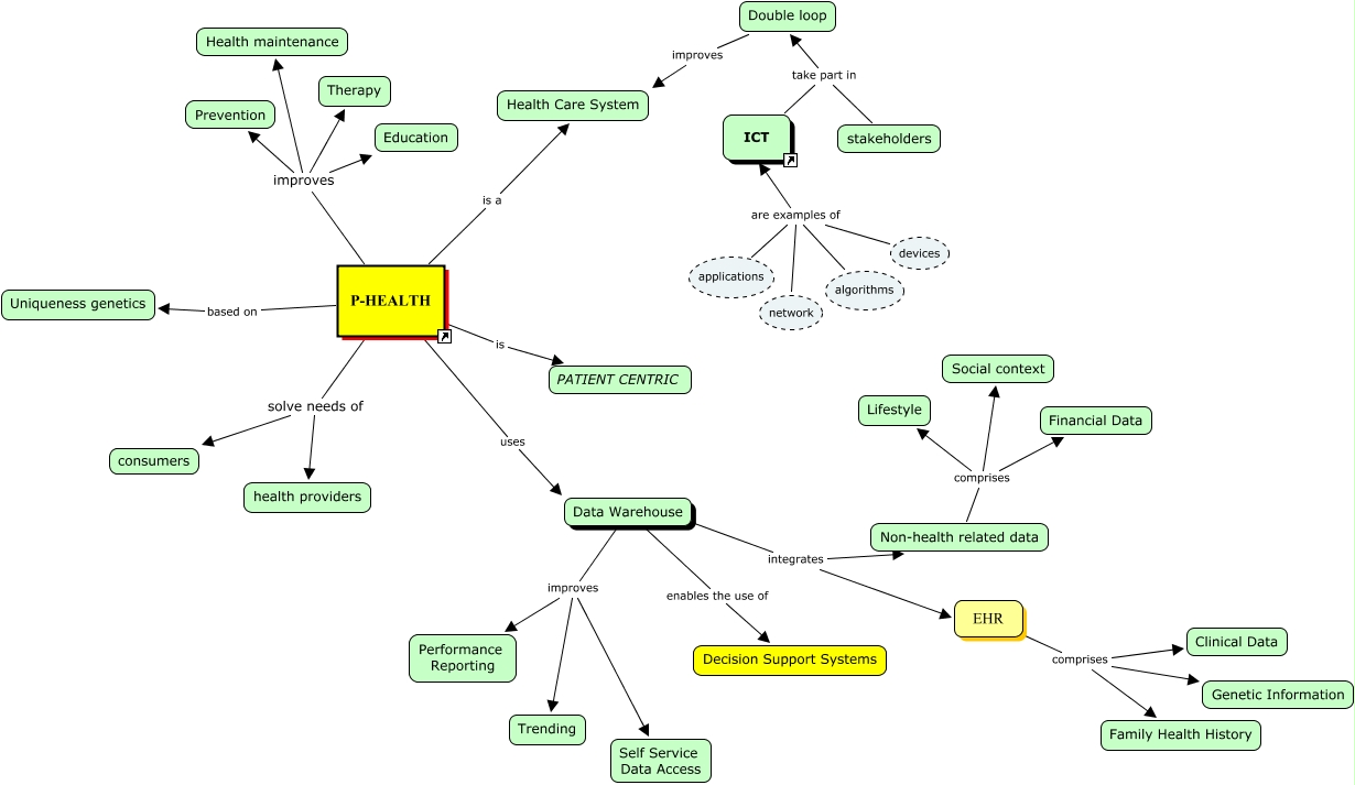 Questa Cmap, creata con IHMC CmapTools, contiene informazioni relative a: Core, devices are examples of ICT, ICT take part in Double loop, P-HEALTH improves Health maintenance, Data Warehouse improves Trending, EHR comprises Family Health History, EHR comprises Genetic Information, P-HEALTH solve needs of consumers, Data Warehouse integrates EHR, devices are examples of applications, Data Warehouse improves Self Service Data Access, network are examples of applications, P-HEALTH is PATIENT CENTRIC, P-HEALTH solve needs of health providers, algorithms are examples of applications, algorithms are examples of ICT, Data Warehouse enables the use of Decision Support Systems, Data Warehouse integrates Non-health related data, P-HEALTH improves Prevention, P-HEALTH is a Health Care System, Data Warehouse improves Performance Reporting