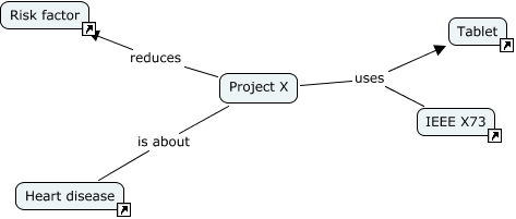 Este Cmap, tiene información relacionada con: Example project, Project X uses IEEE X73, Project X uses Tablet, Project X is about Heart disease, Project X reduces Risk factor