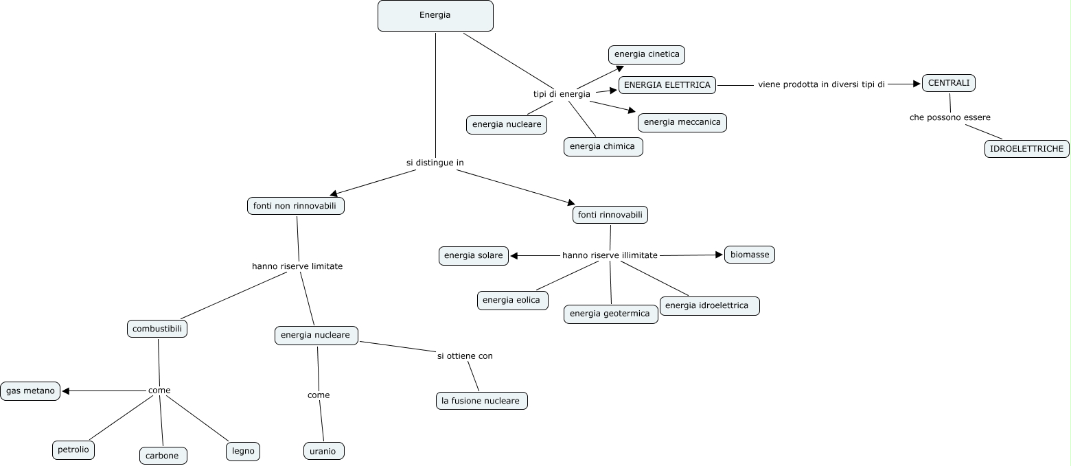 Questa Cmap, creata con IHMC CmapTools, contiene informazioni relative a: mappa energia laura b.cmap, ENERGIA ELETTRICA viene prodotta in diversi tipi di CENTRALI, fonti rinnovabili hanno riserve illimitate energia solare, combustibili come legno, CENTRALI che possono essere IDROELETTRICHE, combustibili come gas metano, energia nucleare si ottiene con la fusione nucleare, Energia si distingue in fonti non rinnovabili, fonti non rinnovabili hanno riserve limitate energia nucleare, Energia si distingue in fonti rinnovabili, combustibili come carbone, Energia tipi di energia ENERGIA ELETTRICA, fonti rinnovabili hanno riserve illimitate energia eolica, combustibili come petrolio, fonti rinnovabili hanno riserve illimitate energia geotermica, fonti rinnovabili hanno riserve illimitate biomasse, Energia tipi di energia energia chimica, Energia tipi di energia energia cinetica, fonti rinnovabili hanno riserve illimitate energia idroelettrica, Energia tipi di energia energia meccanica, fonti non rinnovabili hanno riserve limitate combustibili