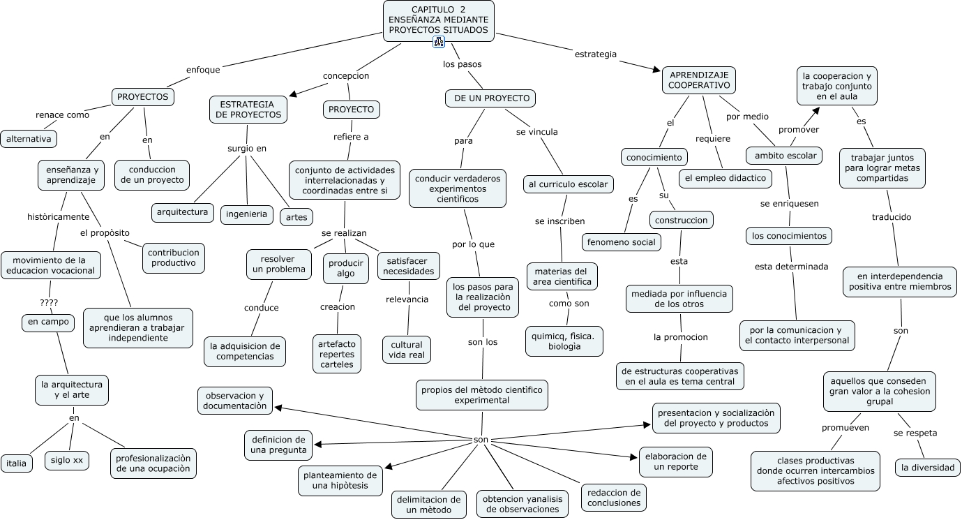 Este Cmap, tiene información relacionada con: cap 2, los pasos para la realizaciòn del proyecto son los propios del mètodo cientìfico experimental, mediada por influencia de los otros la promocion de estructuras cooperativas en el aula es tema central, obtencion yanalisis de observaciones son observacion y documentaciòn, propios del mètodo cientìfico experimental son redaccion de conclusiones, PROYECTO refiere a conjunto de actividades interrelacionadas y coordinadas entre si, la arquitectura y el arte en profesionalizaciòn de una ocupaciòn, los conocimientos esta determinada por la comunicacion y el contacto interpersonal, enseñanza y aprendizaje històricamente movimiento de la educacion vocacional, PROYECTOS renace como alternativa, trabajar juntos para lograr metas compartidas traducido en interdependencia positiva entre miembros, PROYECTOS en enseñanza y aprendizaje, propios del mètodo cientìfico experimental son planteamiento de una hipòtesis, enseñanza y aprendizaje el propòsito contribucion productivo, ESTRATEGIA DE PROYECTOS surgio en artes, CAPITULO 2 ENSEÑANZA MEDIANTE PROYECTOS SITUADOS concepcion ESTRATEGIA DE PROYECTOS, CAPITULO 2 ENSEÑANZA MEDIANTE PROYECTOS SITUADOS concepcion PROYECTO, CAPITULO 2 ENSEÑANZA MEDIANTE PROYECTOS SITUADOS estrategia APRENDIZAJE COOPERATIVO, la arquitectura y el arte en siglo xx, resolver un problema conduce la adquisicion de competencias, conjunto de actividades interrelacionadas y coordinadas entre si se realizan resolver un problema