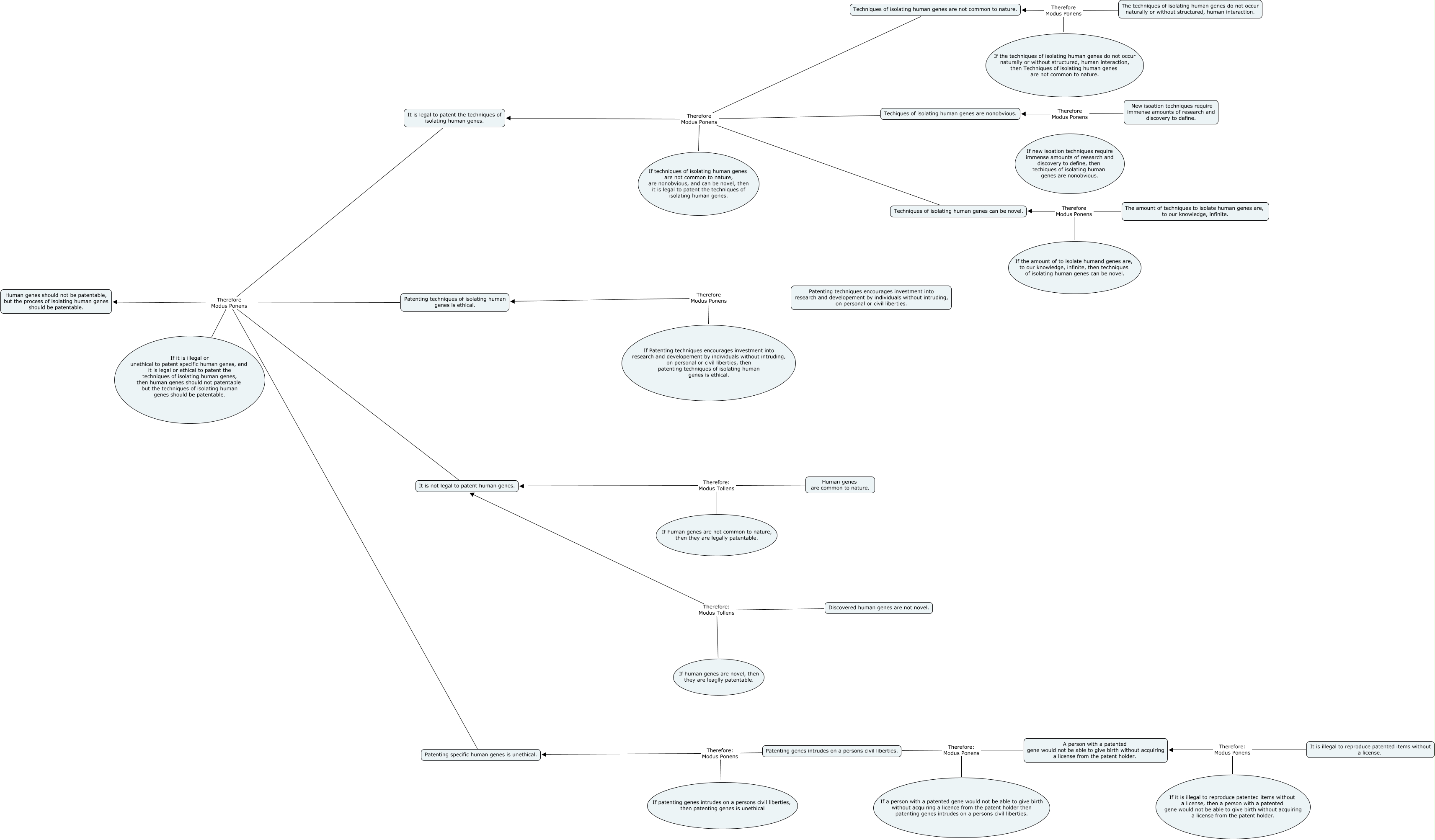 This Concept Map, created with IHMC CmapTools, has information related to: Ian, Jordan, Taylor, Stepahnie_Gene Patent, Patenting genes intrudes on a persons civil liberties. Therefore: Modus Ponens Patenting specific human genes is unethical., If Patenting techniques encourages investment into research and developement by individuals without intruding, on personal or civil liberties, then patenting techniques of isolating human genes is ethical. Therefore Modus Ponens Patenting techniques of isolating human genes is ethical., If new isoation techniques require immense amounts of research and discovery to define, then techiques of isolating human genes are nonobvious. Therefore Modus Ponens Techiques of isolating human genes are nonobvious., Techniques of isolating human genes are not common to nature. Therefore Modus Ponens It is legal to patent the techniques of isolating human genes., Patenting techniques of isolating human genes is ethical. Therefore Modus Ponens If it is illegal or unethical to patent specific human genes, and it is legal or ethical to patent the techniques of isolating human genes, then human genes should not patentable but the techniques of isolating human genes should be patentable., Patenting genes intrudes on a persons civil liberties. Therefore: Modus Ponens If patenting genes intrudes on a persons civil liberties, then patenting genes is unethical, Patenting specific human genes is unethical. Therefore Modus Ponens Human genes should not be patentable, but the process of isolating human genes should be patentable., It is not legal to patent human genes. Therefore Modus Ponens Human genes should not be patentable, but the process of isolating human genes should be patentable., Discovered human genes are not novel. Therefore: Modus Tollens It is not legal to patent human genes., If the techniques of isolating human genes do not occur naturally or without structured, human interaction, then Techniques of isolating human genes are not common to nature. Therefore Modus Ponens Techniques of isolating human genes are not common to nature., A person with a patented gene would not be able to give birth without acquiring a license from the patent holder. Therefore: Modus Ponens If a person with a patented gene would not be able to give birth without acquiring a licence from the patent holder then patenting genes intrudes on a persons civil liberties., Human genes are common to nature. Therefore: Modus Tollens It is not legal to patent human genes., It is legal to patent the techniques of isolating human genes. Therefore Modus Ponens If it is illegal or unethical to patent specific human genes, and it is legal or ethical to patent the techniques of isolating human genes, then human genes should not patentable but the techniques of isolating human genes should be patentable., Patenting techniques encourages investment into research and developement by individuals without intruding, on personal or civil liberties. Therefore Modus Ponens Patenting techniques of isolating human genes is ethical., If techniques of isolating human genes are not common to nature, are nonobvious, and can be novel, then it is legal to patent the techniques of isolating human genes. Therefore Modus Ponens It is legal to patent the techniques of isolating human genes., Patenting genes intrudes on a persons civil liberties. Therefore: Modus Ponens If a person with a patented gene would not be able to give birth without acquiring a licence from the patent holder then patenting genes intrudes on a persons civil liberties., It is legal to patent the techniques of isolating human genes. Therefore Modus Ponens Human genes should not be patentable, but the process of isolating human genes should be patentable., Discovered human genes are not novel. Therefore: Modus Tollens If human genes are novel, then they are leaglly patentable., If the amount of to isolate humand genes are, to our knowledge, infinite, then techniques of isolating human genes can be novel. Therefore Modus Ponens Techniques of isolating human genes can be novel., Techniques of isolating human genes can be novel. Therefore Modus Ponens It is legal to patent the techniques of isolating human genes.