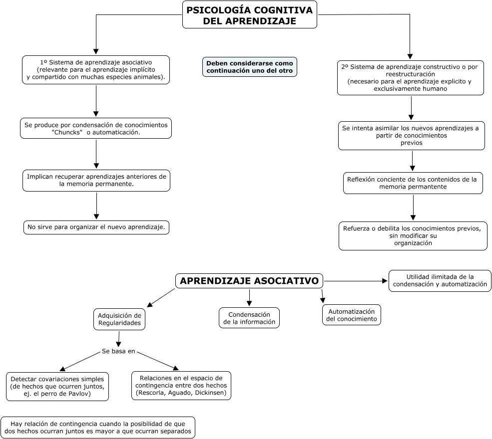 Este Cmap, tiene información relacionada con: Psicología cognitiva del aprendizaje, APRENDIZAJE ASOCIATIVO Adquisición de Regularidades, Implican recuperar aprendizajes anteriores de la memoria permanente. No sirve para organizar el nuevo aprendizaje., Adquisición de Regularidades Se basa en Relaciones en el espacio de contingencia entre dos hechos (Rescorla, Aguado, Dickinsen), PSICOLOGÍA COGNITIVA DEL APRENDIZAJE 1º Sistema de aprendizaje asociativo (relevante para el aprendizaje implícito y compartido con muchas especies animales)., APRENDIZAJE ASOCIATIVO Utilidad ilimitada de la condensación y automatización, Se produce por condensación de conocimientos "Chuncks" o automaticación. Implican recuperar aprendizajes anteriores de la memoria permanente., Se intenta asimilar los nuevos aprendizajes a partir de conocimientos previos Reflexión conciente de los contenidos de la memoria permantente, Adquisición de Regularidades Se basa en Detectar covariaciones simples (de hechos que ocurren juntos, ej. el perro de Pavlov), APRENDIZAJE ASOCIATIVO Condensación de la información, 2º Sistema de aprendizaje constructivo o por reestructuración (necesario para el aprendizaje explicito y exclusivamente humano Se intenta asimilar los nuevos aprendizajes a partir de conocimientos previos, Reflexión conciente de los contenidos de la memoria permantente Refuerza o debilita los conocimientos previos, sin modificar su organización, 1º Sistema de aprendizaje asociativo (relevante para el aprendizaje implícito y compartido con muchas especies animales). Se produce por condensación de conocimientos "Chuncks" o automaticación., APRENDIZAJE ASOCIATIVO Automatización del conocimiento, PSICOLOGÍA COGNITIVA DEL APRENDIZAJE 2º Sistema de aprendizaje constructivo o por reestructuración (necesario para el aprendizaje explicito y exclusivamente humano