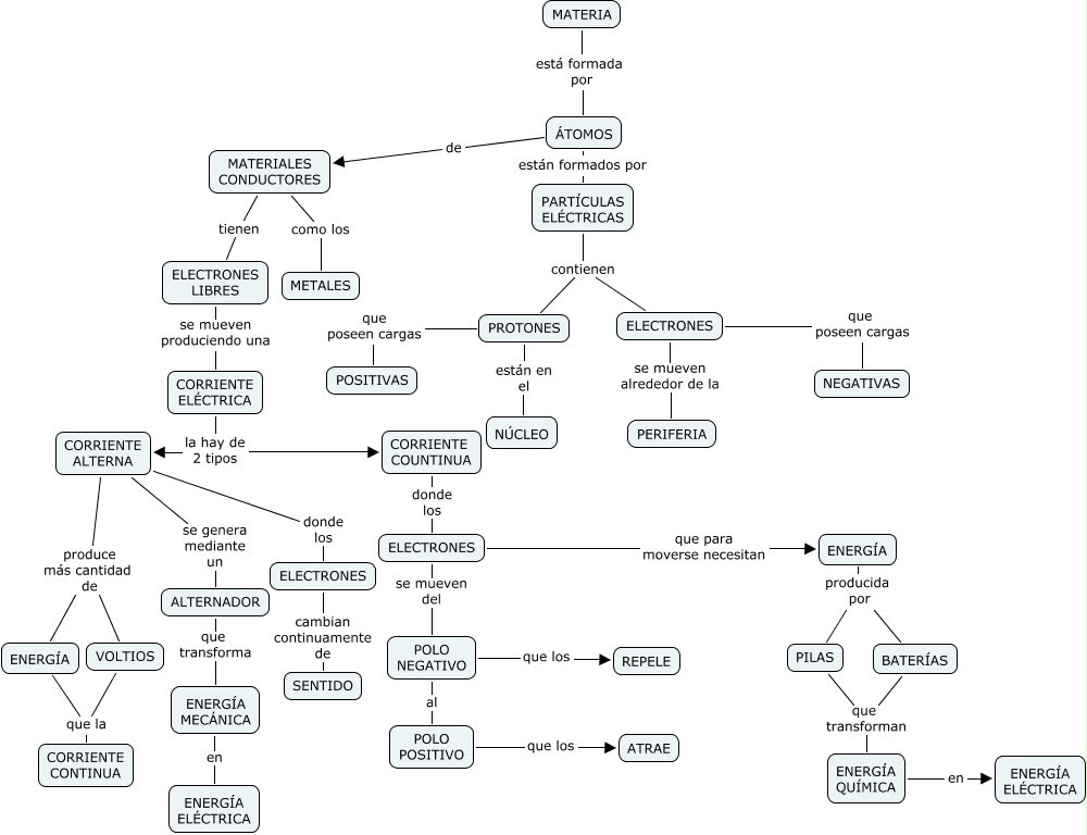 Este Cmap, tiene información relacionada con: corriente_electrica_alejandro, ENERGÍA QUÍMICA en ENERGÍA ELÉCTRICA, ELECTRONES se mueven alrededor de la PERIFERIA, ELECTRONES se mueven del POLO NEGATIVO, CORRIENTE ELÉCTRICA la hay de 2 tipos CORRIENTE ALTERNA, CORRIENTE ALTERNA donde los ELECTRONES, ENERGÍA producida por PILAS, ELECTRONES que para moverse necesitan ENERGÍA, CORRIENTE ELÉCTRICA la hay de 2 tipos CORRIENTE COUNTINUA, PARTÍCULAS ELÉCTRICAS contienen PROTONES, PROTONES que poseen cargas POSITIVAS, ENERGÍA que la CORRIENTE CONTINUA, ELECTRONES que poseen cargas NEGATIVAS, POLO POSITIVO que los ATRAE, ÁTOMOS de MATERIALES CONDUCTORES, BATERÍAS que transforman ENERGÍA QUÍMICA, MATERIALES CONDUCTORES tienen ELECTRONES LIBRES, POLO NEGATIVO que los REPELE, MATERIALES CONDUCTORES como los METALES, ALTERNADOR que transforma ENERGÍA MECÁNICA, VOLTIOS que la CORRIENTE CONTINUA