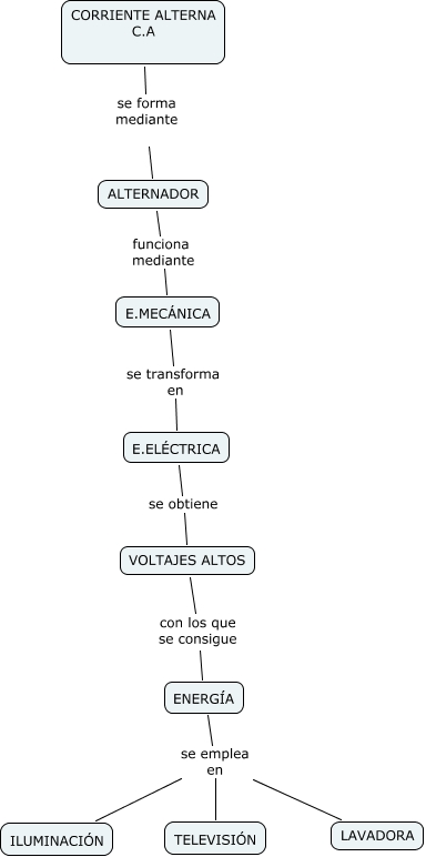Este Cmap, tiene información relacionada con: corriente_alterna_paulah, VOLTAJES ALTOS con los que se consigue ENERGÍA, ALTERNADOR funciona mediante E.MECÁNICA, ENERGÍA se emplea en LAVADORA, CORRIENTE ALTERNA C.A se forma mediante ALTERNADOR, ENERGÍA se emplea en ILUMINACIÓN, ENERGÍA se emplea en TELEVISIÓN, E.ELÉCTRICA se obtiene VOLTAJES ALTOS, E.MECÁNICA se transforma en E.ELÉCTRICA