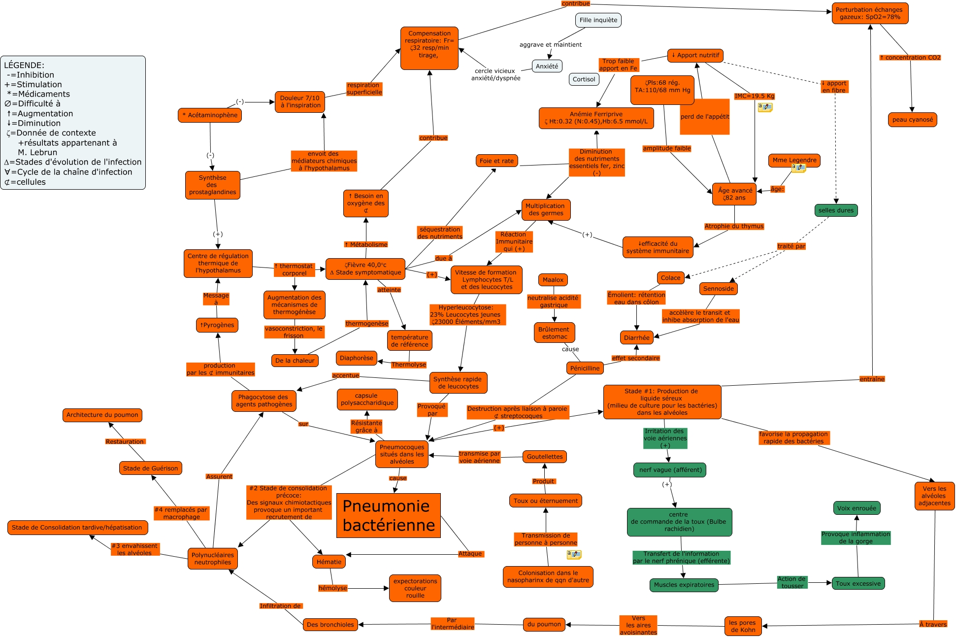 et des leucocytes </mtext> </mrow> </math>, Pneumocoques situés dans les alvéoles (+) Stade #1: Production de liquide séreux (milieu de culture pour les bactéries) dans les alvéoles, Des bronchioles Infiltration de Polynucléaires neutrophiles, Mme Legendre âge: Âge avancé ζ82 ans, Compensation respiratoire: Fr= ζ32 resp/min tirage, contribue Perturbation échanges gazeux: SpO2=78%, Colace Émolient: rétention eau dans côlon Diarrhée, ↑Pyrogènes Message à Centre de régulation thermique de l'hypothalamus, ζPls:68 rég. TA:110/68 mm Hg amplitude faible Âge avancé ζ82 ans, Muscles expiratoires Action de tousser Toux excessive, Vers les alvéoles adjacentes À travers les pores de Kohn, Synthèse des prostaglandines (+) Centre de régulation thermique de l'hypothalamus, Pénicilline cause Brûlement estomac, Âge avancé ζ82 ans perd de l'appétit ↓ Apport nutritif