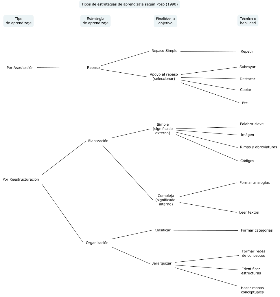 Este Cmap, tiene información relacionada con: Tipos de estrategias de aprendizaje según Pozo (1990), Jerarquizar Identificar estructuras, Compleja (significado interno) Formar analogías, Apoyo al repaso (seleccionar) Destacar, Apoyo al repaso (seleccionar) Subrayar, Apoyo al repaso (seleccionar) Etc., Elaboración Compleja (significado interno), Simple (significado externo) Códigos, Jerarquizar Hacer mapas conceptuales, Repaso Simple Repetir, Por Asosicación Repaso Repaso Simple, Simple (significado externo) Palabra-clave, Jerarquizar Formar redes de conceptos, Organización Jerarquizar, Por Reestructuración Elaboración, Simple (significado externo) Imágen, Apoyo al repaso (seleccionar) Copiar, Por Asosicación Repaso Apoyo al repaso (seleccionar), Por Reestructuración Organización, Compleja (significado interno) Leer textos, Clasificar Formar categorías