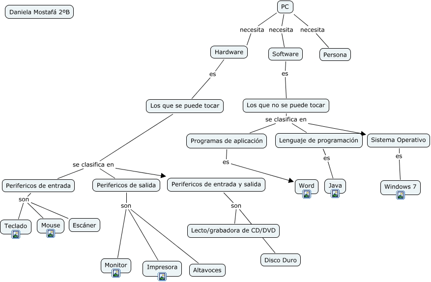 Este Cmap, tiene información relacionada con: Daniela Hard y Soft, Hardware es Los que se puede tocar, Perifericos de entrada son Escáner, Los que se puede tocar se clasifica en Perifericos de entrada y salida, Perifericos de salida son Monitor, PC necesita Software, PC necesita Hardware, Los que se puede tocar se clasifica en Perifericos de salida, Software es Los que no se puede tocar, Perifericos de entrada y salida son Lecto/grabadora de CD/DVD, Perifericos de entrada son Teclado, Los que no se puede tocar se clasifica en Lenguaje de programación, Lenguaje de programación es Java, Perifericos de salida son Impresora, Perifericos de entrada son Mouse, Perifericos de entrada y salida son Disco Duro, Sistema Operativo es Windows 7, Programas de aplicación es Word, Los que no se puede tocar se clasifica en Sistema Operativo, Los que se puede tocar se clasifica en Perifericos de entrada, PC necesita Persona