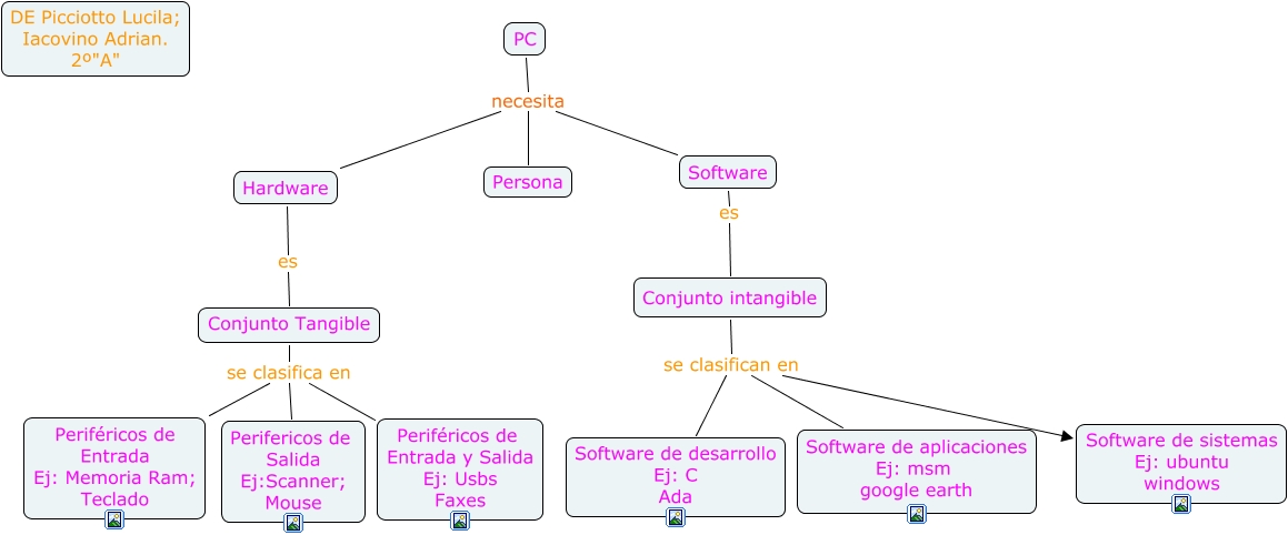 Este Cmap, tiene información relacionada con: Lu , adro hard y soft, Conjunto intangible se clasifican en Software de desarrollo Ej: C Ada, Conjunto Tangible se clasifica en Periféricos de Entrada y Salida Ej: Usbs Faxes, PC necesita Hardware, PC necesita Persona, PC necesita Software, Hardware es Conjunto Tangible, Conjunto Tangible se clasifica en Periféricos de Entrada Ej: Memoria Ram; Teclado, Conjunto Tangible se clasifica en Perifericos de Salida Ej:Scanner; Mouse, Conjunto intangible se clasifican en Software de aplicaciones Ej: msm google earth, Conjunto intangible se clasifican en Software de sistemas Ej: ubuntu windows, Software es Conjunto intangible