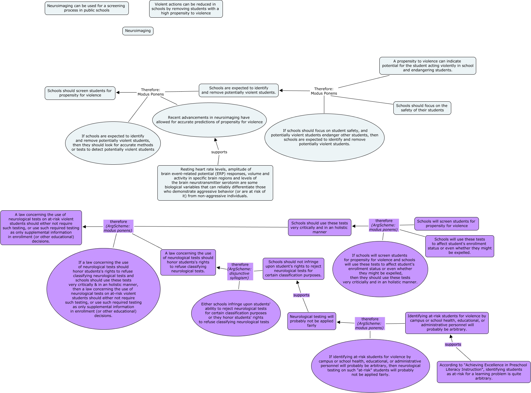 This Concept Map, created with IHMC CmapTools, has information related to: 15.G-edited, If a law concerning the use of neurological tests should honor students's rights to refuse classifying neurological tests and schools should use these tests very critically & in an holistic manner, then a law concerning the use of neurological tests on at-risk violent students should either not require such testing, or use such required testing as only supplemental information in enrollment (or other educational) decisions. therefore (ArgScheme: modus ponens) A law concerning the use of neurological tests on at-risk violent students should either not require such testing, or use such required testing as only supplemental information in enrollment (or other educational) decisions., If identifying at-risk students for violence by campus or school health, educational, or administrative personnel will probably be arbitrary, then neurological testing on such "at-risk" students will probably not be applied fairly. therefore (ArgScheme: modus ponens) Neurological testing will probably not be applied fairly, Schools are expected to identify and remove potentially violent students. Therefore: Modus Ponens If schools are expected to identify and remove potentially violent students, then they should look for accurate methods or tests to detect potentially violent students, If schools will screen students for propensity for violence and schools will use these tests to affect student's enrollment status or even whether they might be expelled, then they should use these tests very criticially and in an holistic manner. therefore (ArgScheme: modus ponens) Schools should use these tests very critically and in an holistic manner, A propensity to violence can indicate potential for the student acting violently in school and endangering students. Therefore: Modus Ponens If schools should focus on student safety, and potentially violent students endanger other students, then schools are expected to identify and remove potentially violent students., Neurological testing will probably not be applied fairly supports Schools should not infringe upon student's rights to reject neurological tests for certain classification purposes., Either schools infringe upon students' ability to reject neurological tests for certain classification purposes or they honor students' rights to refuse classifying neurological tests therefore (ArgScheme: disjunctive syllogism) A law concerning the use of neurological tests should honor students's rights to refuse classifying neurological tests., A law concerning the use of neurological tests should honor students's rights to refuse classifying neurological tests. therefore (ArgScheme: modus ponens) A law concerning the use of neurological tests on at-risk violent students should either not require such testing, or use such required testing as only supplemental information in enrollment (or other educational) decisions., Recent advancements in neuroimaging have allowed for accurate predictions of propensity for violence Therefore: Modus Ponens If schools are expected to identify and remove potentially violent students, then they should look for accurate methods or tests to detect potentially violent students, Schools should use these tests very critically and in an holistic manner therefore (ArgScheme: modus ponens) A law concerning the use of neurological tests on at-risk violent students should either not require such testing, or use such required testing as only supplemental information in enrollment (or other educational) decisions., Schools should focus on the safety of their students Therefore: Modus Ponens Schools are expected to identify and remove potentially violent students., Schools will use these tests to affect student's enrollment status or even whether they might be expelled. therefore (ArgScheme: modus ponens) Schools should use these tests very critically and in an holistic manner, Schools are expected to identify and remove potentially violent students. Therefore: Modus Ponens Schools should screen students for propensity for violence, According to "Achieving Excellence in Preschool Literacy Instruction", identifying students as at-risk for a learning problem is quite arbitrary. supports Identifying at-risk students for violence by campus or school health, educational, or administrative personnel will probably be arbitrary., Recent advancements in neuroimaging have allowed for accurate predictions of propensity for violence Therefore: Modus Ponens Schools should screen students for propensity for violence, Schools should not infringe upon student's rights to reject neurological tests for certain classification purposes. therefore (ArgScheme: disjunctive syllogism) A law concerning the use of neurological tests should honor students's rights to refuse classifying neurological tests., Identifying at-risk students for violence by campus or school health, educational, or administrative personnel will probably be arbitrary. therefore (ArgScheme: modus ponens) Neurological testing will probably not be applied fairly, A propensity to violence can indicate potential for the student acting violently in school and endangering students. Therefore: Modus Ponens Schools are expected to identify and remove potentially violent students., Resting heart rate levels, amplitude of brain event-related potential (ERP) responses, volume and activity in specific brain regions and levels of the brain neurotransmitter serotonin are some biological variables that can reliably differentiate those who demonstrate aggressive behavior (or are at risk of it) from non-aggressive individuals. supports Recent advancements in neuroimaging have allowed for accurate predictions of propensity for violence, Schools will screen students for propensity for violence therefore (ArgScheme: modus ponens) Schools should use these tests very critically and in an holistic manner