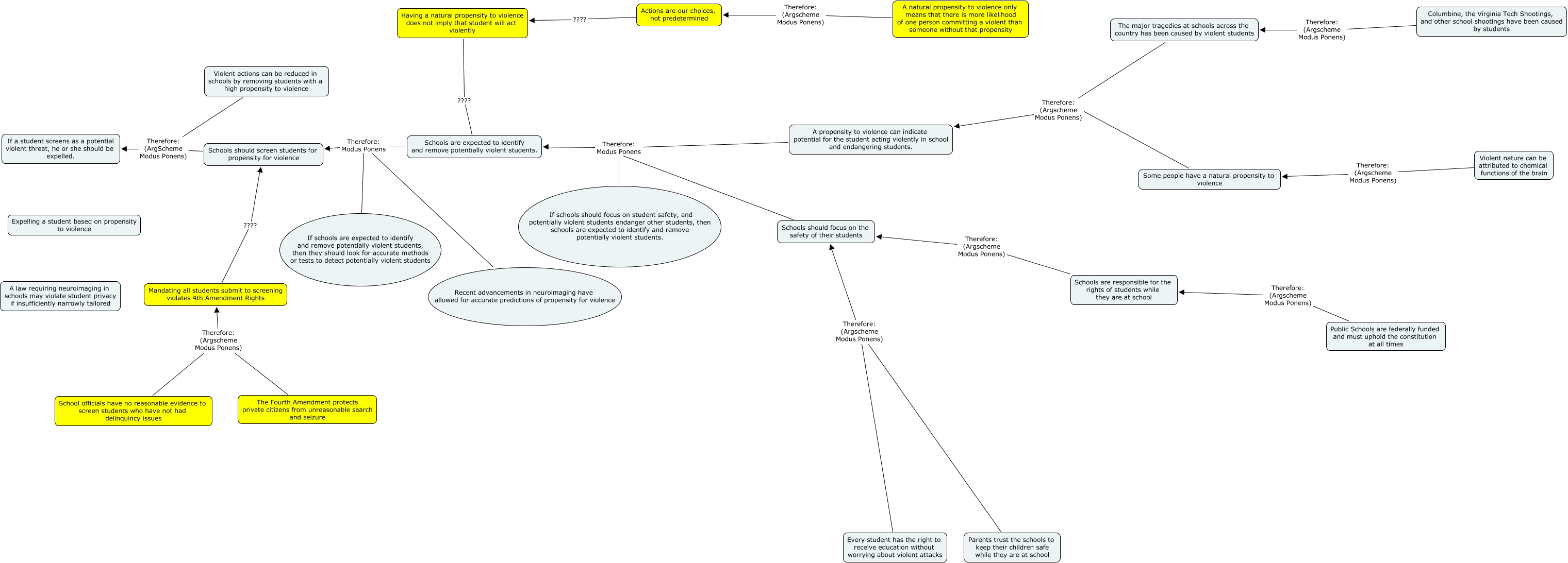 This Concept Map, created with IHMC CmapTools, has information related to: 15.G-editedMSS, Some people have a natural propensity to violence Therefore: (Argscheme Modus Ponens) A propensity to violence can indicate potential for the student acting violently in school and endangering students., Recent advancements in neuroimaging have allowed for accurate predictions of propensity for violence Therefore: Modus Ponens If schools are expected to identify and remove potentially violent students, then they should look for accurate methods or tests to detect potentially violent students, Schools should focus on the safety of their students Therefore: Modus Ponens If schools should focus on student safety, and potentially violent students endanger other students, then schools are expected to identify and remove potentially violent students., Every student has the right to receive education without worrying about violent attacks Therefore: (Argscheme Modus Ponens) Schools should focus on the safety of their students, Violent nature can be attributed to chemical functions of the brain Therefore: (Argscheme Modus Ponens) Some people have a natural propensity to violence, A natural propensity to violence only means that there is more likelihood of one person committing a violent than someone without that propensity Therefore: (Argscheme Modus Ponens) Actions are our choices, not predetermined, The Fourth Amendment protects private citizens from unreasonable search and seizure Therefore: (Argscheme Modus Ponens) Mandating all students submit to screening violates 4th Amendment Rights, A propensity to violence can indicate potential for the student acting violently in school and endangering students. Therefore: Modus Ponens If schools should focus on student safety, and potentially violent students endanger other students, then schools are expected to identify and remove potentially violent students., Parents trust the schools to keep their children safe while they are at school Therefore: (Argscheme Modus Ponens) Schools should focus on the safety of their students, A propensity to violence can indicate potential for the student acting violently in school and endangering students. Therefore: Modus Ponens Schools are expected to identify and remove potentially violent students., The major tragedies at schools across the country has been caused by violent students Therefore: (Argscheme Modus Ponens) A propensity to violence can indicate potential for the student acting violently in school and endangering students., School officials have no reasonable evidence to screen students who have not had delinquincy issues Therefore: (Argscheme Modus Ponens) Mandating all students submit to screening violates 4th Amendment Rights, Mandating all students submit to screening violates 4th Amendment Rights ???? Schools should screen students for propensity for violence, Schools should focus on the safety of their students Therefore: Modus Ponens Schools are expected to identify and remove potentially violent students., Actions are our choices, not predetermined ???? Having a natural propensity to violence does not imply that student will act violently, Having a natural propensity to violence does not imply that student will act violently ???? Schools are expected to identify and remove potentially violent students., Violent actions can be reduced in schools by removing students with a high propensity to violence Therefore: (ArgScheme Modus Ponens) If a student screens as a potential violent threat, he or she should be expelled., Schools are expected to identify and remove potentially violent students. Therefore: Modus Ponens Schools should screen students for propensity for violence, Schools are responsible for the rights of students while they are at school Therefore: (Argscheme Modus Ponens) Schools should focus on the safety of their students, Recent advancements in neuroimaging have allowed for accurate predictions of propensity for violence Therefore: Modus Ponens Schools should screen students for propensity for violence