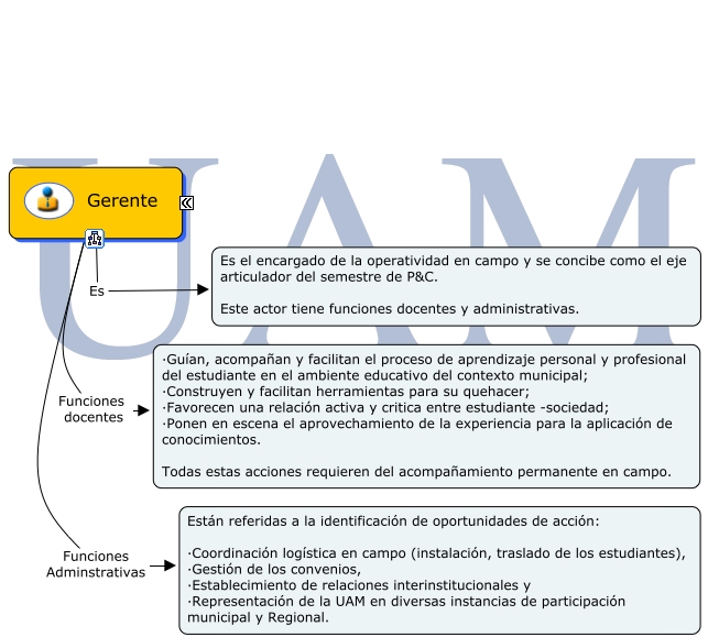 Este Cmap, tiene información relacionada con: Gerentes, ???? Funciones Adminstrativas Están referidas a la identificación de oportunidades de acción: ·Coordinación logística en campo (instalación, traslado de los estudiantes), ·Gestión de los convenios, ·Establecimiento de relaciones interinstitucionales y ·Representación de la UAM en diversas instancias de participación municipal y Regional., ???? Funciones docentes ·Guían, acompañan y facilitan el proceso de aprendizaje personal y profesional del estudiante en el ambiente educativo del contexto municipal; ·Construyen y facilitan herramientas para su quehacer; ·Favorecen una relación activa y critica entre estudiante -sociedad; ·Ponen en escena el aprovechamiento de la experiencia para la aplicación de conocimientos. Todas estas acciones requieren del acompañamiento permanente en campo., ???? Es Es el encargado de la operatividad en campo y se concibe como el eje articulador del semestre de P&C. Este actor tiene funciones docentes y administrativas.
