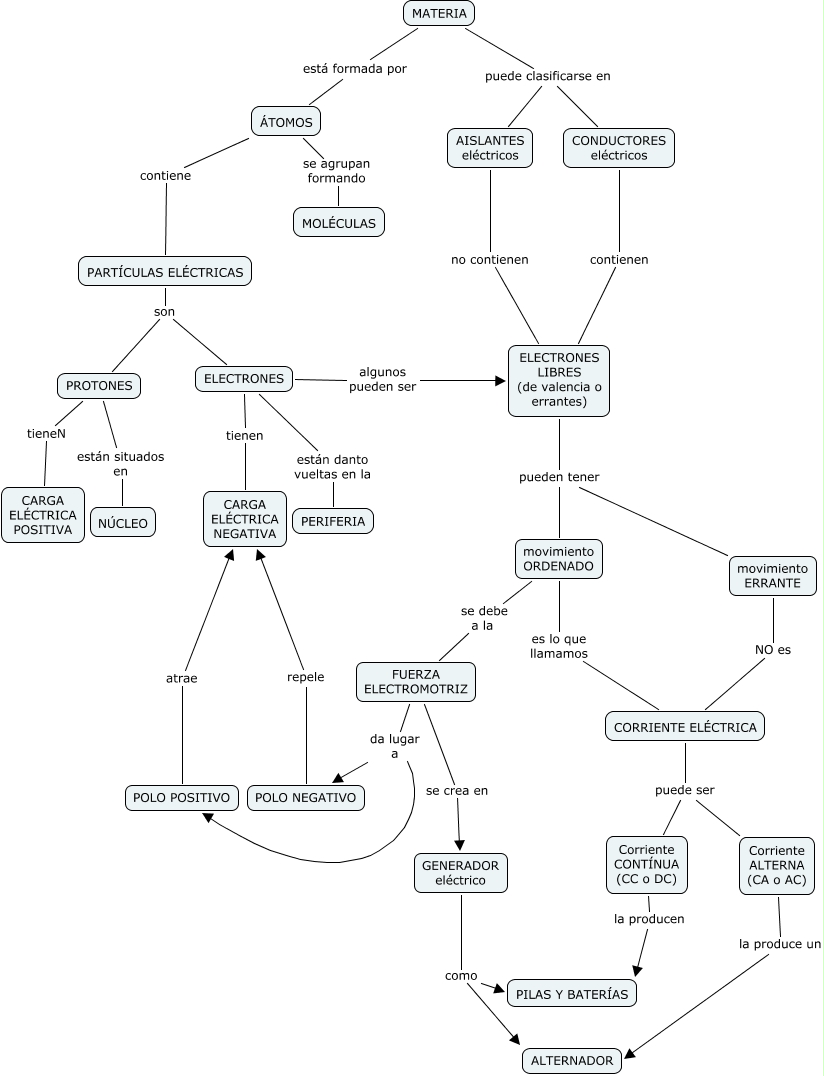 Este Cmap, tiene información relacionada con: 3ESO3T-CorrienteElectrica_01, CONDUCTORES eléctricos contienen ELECTRONES LIBRES (de valencia o errantes), ELECTRONES algunos pueden ser ELECTRONES LIBRES (de valencia o errantes), AISLANTES eléctricos no contienen ELECTRONES LIBRES (de valencia o errantes), Corriente ALTERNA (CA o AC) la produce un ALTERNADOR, GENERADOR eléctrico como PILAS Y BATERÍAS, PROTONES están situados en NÚCLEO, Corriente CONTÍNUA (CC o DC) la producen PILAS Y BATERÍAS, GENERADOR eléctrico como ALTERNADOR, ELECTRONES tienen CARGA ELÉCTRICA NEGATIVA, movimiento ORDENADO es lo que llamamos CORRIENTE ELÉCTRICA, movimiento ERRANTE NO es CORRIENTE ELÉCTRICA, CORRIENTE ELÉCTRICA puede ser Corriente CONTÍNUA (CC o DC), ELECTRONES están danto vueltas en la PERIFERIA, ELECTRONES LIBRES (de valencia o errantes) pueden tener movimiento ORDENADO, ÁTOMOS contiene PARTÍCULAS ELÉCTRICAS, MATERIA puede clasificarse en AISLANTES eléctricos, ÁTOMOS se agrupan formando MOLÉCULAS, FUERZA ELECTROMOTRIZ se crea en GENERADOR eléctrico, PARTÍCULAS ELÉCTRICAS son ELECTRONES, CORRIENTE ELÉCTRICA puede ser Corriente ALTERNA (CA o AC)