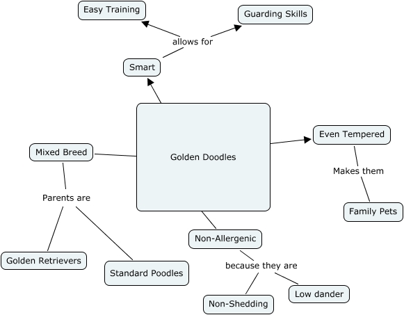 This Concept Map, created with IHMC CmapTools, has information related to: Golden Doodles-LOeder, Mixed Breed ???? Golden Doodles, Golden Doodles ???? Even Tempered, Smart allows for Easy Training, Mixed Breed Parents are Golden Retrievers, Golden Doodles ???? Non-Allergenic, Golden Doodles ???? Smart, Non-Allergenic because they are Low dander, Mixed Breed Parents are Standard Poodles, Even Tempered Makes them Family Pets, Smart allows for Guarding Skills, Non-Allergenic because they are Non-Shedding