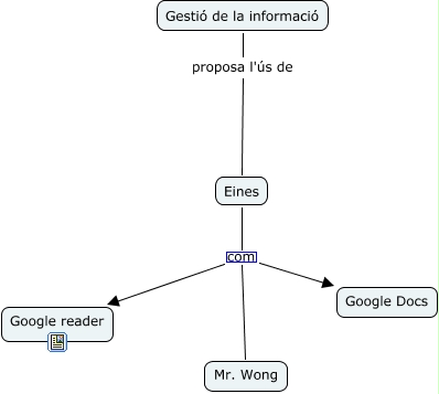 Este Cmap, tiene información relacionada con: gestio de la informacio mireia moya, Eines com Mr. Wong, Gestió de la informació proposa l'ús de Eines, Eines com Google Docs, Eines com Google reader