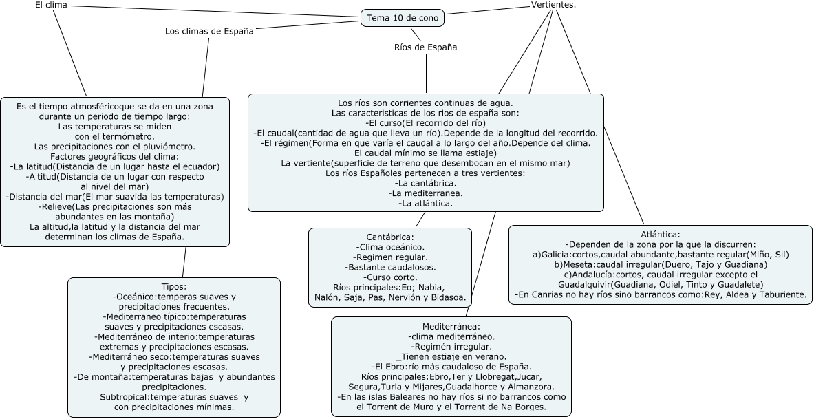 Este Cmap, tiene información relacionada con: Luis lópez Díez cono 10 tema, Tema 10 de cono Vertientes. Cantábrica: -Clima oceánico. -Regimen regular. -Bastante caudalosos. -Curso corto. Ríos principales:Eo; Nabia, Nalón, Saja, Pas, Nervión y Bidasoa., Tema 10 de cono Vertientes. Atlántica: -Dependen de la zona por la que la discurren: a)Galicia:cortos,caudal abundante,bastante regular(Miño, Sil) b)Meseta:caudal irregular(Duero, Tajo y Guadiana) c)Andalucía:cortos, caudal irregular excepto el Guadalquivir(Guadiana, Odiel, Tinto y Guadalete) -En Canrias no hay ríos sino barrancos como:Rey, Aldea y Taburiente., Tema 10 de cono Ríos de España Los ríos son corrientes continuas de agua. Las caracteristicas de los rios de españa son: -El curso(El recorrido del río) -El caudal(cantidad de agua que lleva un río).Depende de la longitud del recorrido. -El régimen(Forma en que varía el caudal a lo largo del año.Depende del clima. El caudal mínimo se llama estiaje) La vertiente(superficie de terreno que desembocan en el mismo mar) Los ríos Españoles pertenecen a tres vertientes: -La cantábrica. -La mediterranea. -La atlántica., Tema 10 de cono Vertientes. Mediterránea: -clima mediterráneo. -Regimén irregular. _Tienen estiaje en verano. -El Ebro:río más caudaloso de España. Ríos principales:Ebro,Ter y Llobregat,Jucar, Segura,Turia y Mijares,Guadalhorce y Almanzora. -En las islas Baleares no hay ríos si no barrancos como el Torrent de Muro y el Torrent de Na Borges., Tema 10 de cono Los climas de España Tipos: -Oceánico:temperas suaves y precipitaciones frecuentes. -Mediterraneo típico:temperaturas suaves y precipitaciones escasas. -Mediterráneo de interio:temperaturas extremas y precipitaciones escasas. -Mediterráneo seco:temperaturas suaves y precipitaciones escasas. -De montaña:temperaturas bajas y abundantes precipitaciones. Subtropical:temperaturas suaves y con precipitaciones mínimas., Tema 10 de cono El clima Es el tiempo atmosféricoque se da en una zona durante un periodo de tiempo largo: Las temperaturas se miden con el termómetro. Las precipitaciones con el pluviómetro. Factores geográficos del clima: -La latitud(Distancia de un lugar hasta el ecuador) -Altitud(Distancia de un lugar con respecto al nivel del mar) -Distancia del mar(El mar suavida las temperaturas) -Relieve(Las precipitaciones son más abundantes en las montaña) La altitud,la latitud y la distancia del mar determinan los climas de España.