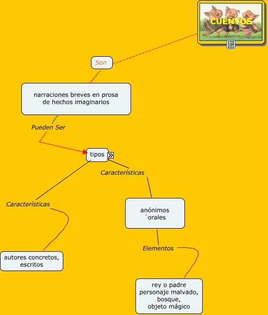 Este Cmap, tiene información relacionada con: cuentos, anónimos ´orales Elementos rey o padre personaje malvado, bosque, objeto mágico, CUENTOS son narraciones breves en prosa de hechos imaginarios, narraciones breves en prosa de hechos imaginarios Pueden Ser literarios, populares Características anónimos ´orales