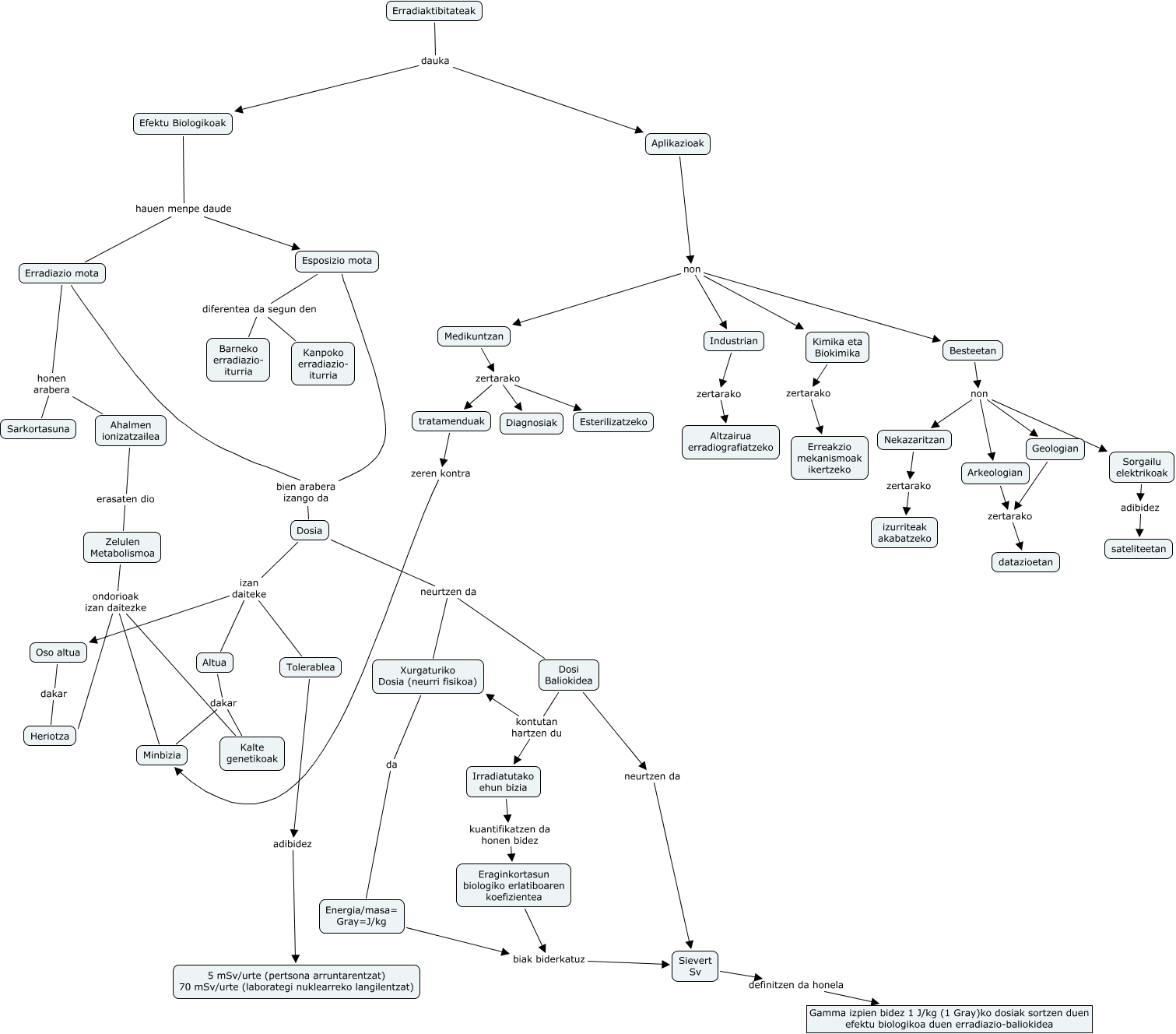 Este Cmap, tiene información relacionada con: ErradiaktibitateaEfektuAplikazioak.cmap, Dosia neurtzen da Xurgaturiko Dosia (neurri fisikoa), Efektu Biologikoak hauen menpe daude Erradiazio mota, Dosia neurtzen da Dosi Baliokidea, Besteetan non Geologian, Altua dakar Minbizia, Eraginkortasun biologiko erlatiboaren koefizientea biak biderkatuz Sievert Sv, Efektu Biologikoak hauen menpe daude Esposizio mota, Sorgailu elektrikoak adibidez sateliteetan, Aplikazioak non Besteetan, Zelulen Metabolismoa ondorioak izan daitezke Minbizia, Xurgaturiko Dosia (neurri fisikoa) da Energia/masa= Gray=J/kg, Esposizio mota diferentea da segun den Kanpoko erradiazio- iturria, Dosia izan daiteke Altua, Esposizio mota diferentea da segun den Barneko erradiazio- iturria, Oso altua dakar Heriotza, Besteetan non Sorgailu elektrikoak, Besteetan non Arkeologian, Dosi Baliokidea kontutan hartzen du Xurgaturiko Dosia (neurri fisikoa), Aplikazioak non Kimika eta Biokimika, Nekazaritzan zertarako izurriteak akabatzeko