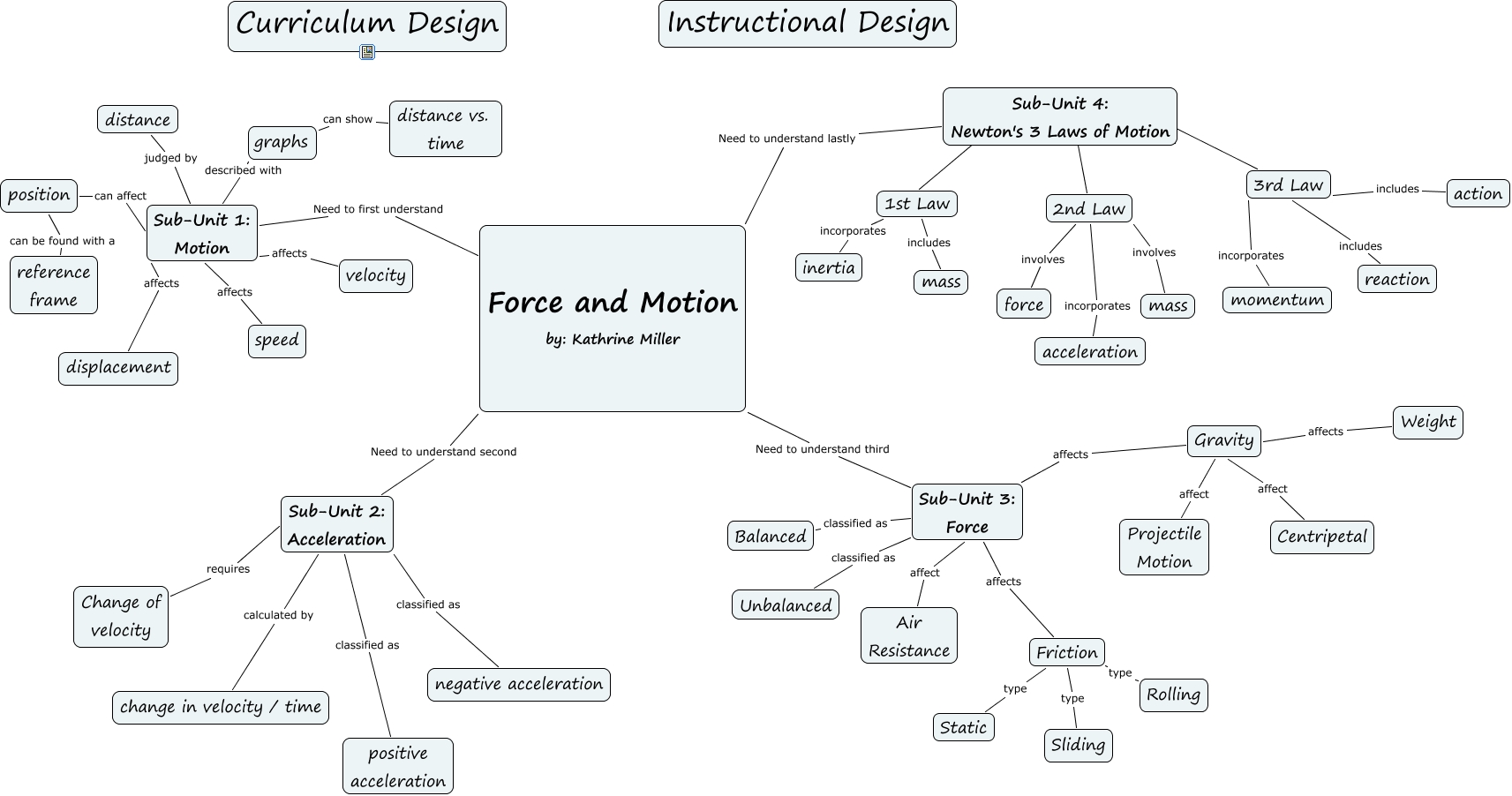This Concept Map, created with IHMC CmapTools, has information related to: EDTL 710- Curriculum Design Project- kmiller_9th grade science, 2nd Law ???? Sub-Unit 4: Newton's 3 Laws of Motion, displacement affects Sub-Unit 1: Motion, action includes 3rd Law, Sliding type Friction, 1st Law ???? Sub-Unit 4: Newton's 3 Laws of Motion, inertia incorporates 1st Law, reference frame can be found with a position, distance judged by Sub-Unit 1: Motion, Sub-Unit 2: Acceleration Need to understand second Force and Motion by: Kathrine Miller, Force and Motion by: Kathrine Miller Need to first understand Sub-Unit 1: Motion, Gravity affects Sub-Unit 3: Force, positive acceleration classified as Sub-Unit 2: Acceleration, Sub-Unit 3: Force Need to understand third Force and Motion by: Kathrine Miller, acceleration incorporates 2nd Law, velocity affects Sub-Unit 1: Motion, Static type Friction, Projectile Motion affect Gravity, mass involves 2nd Law, Friction affects Sub-Unit 3: Force, Change of velocity requires Sub-Unit 2: Acceleration