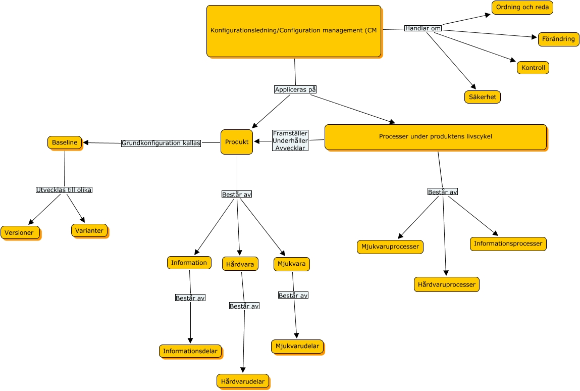 Den här kartan innehåller information om: CM2, Mjukvara Består av Mjukvarudelar, Information Består av Informationsdelar, Produkt Grundkonfiguration kallas Baseline, Konfigurationsledning/Configuration management (CM Handlar om Ordning och reda, Konfigurationsledning/Configuration management (CM Handlar om Förändring, Processer under produktens livscykel Framställer Underhåller Avvecklar Produkt, Processer under produktens livscykel Består av Hårdvaruprocesser, Konfigurationsledning/Configuration management (CM Appliceras på Processer under produktens livscykel, Baseline Utvecklas till olika Varianter, Produkt Består av Hårdvara, Processer under produktens livscykel Består av Informationsprocesser, Konfigurationsledning/Configuration management (CM Handlar om Säkerhet, Hårdvara Består av Hårdvarudelar, Baseline Utvecklas till olika Versioner, Produkt Består av Information, Produkt Består av Mjukvara, Processer under produktens livscykel Består av Mjukvaruprocesser, Konfigurationsledning/Configuration management (CM Handlar om Kontroll, Konfigurationsledning/Configuration management (CM Appliceras på Produkt