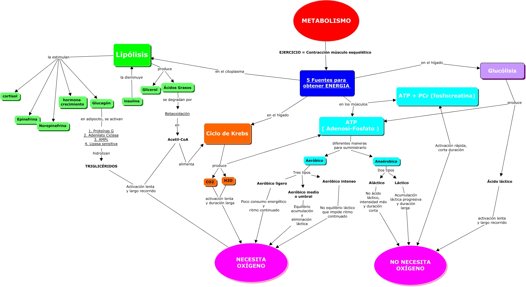 Este Cmap, tiene información relacionada con: 1 Metabolismo, Lipólisis la estimulan Norepinefrina, insulina la disminuye Lipólisis, Lipólisis la estimulan cortisol, Lipólisis la estimulan hormona crecimiento, 5 Fuentes para obtener ENERGIA en el hígado Glucólisis, Aeróbico intenso No equilibrio láctico que impide ritmo continuado NECESITA OXÍGENO, Ácidos Grasos se degradan por Betaoxidación, Aeróbico ligero Poco consumo energético y ritmo continuado NECESITA OXÍGENO, 5 Fuentes para obtener ENERGIA en el citoplasma Lipólisis, Acetil-CoA Activación lenta y largo recorrido NECESITA OXÍGENO, Acetil-CoA alimenta Ciclo de Krebs, Aeróbico Tres tipos Aeróbico intenso, ATP ( Adenosi-Fosfato ) diferentes maneras para suministrarlo Aeróbico, Aláctico No ácido láctico, intensidad máx y duración corta NO NECESITA OXÍGENO, Aeróbico Tres tipos Aeróbico ligero, TRIGLICÉRIDOS Activación lenta y largo recorrido NECESITA OXÍGENO, Lipólisis la estimulan Epinefrina, 1. Proteínas G 2. Adenilato Ciclasa 3. AMPc 4. Lipasa sensitiva hidrolizan TRIGLICÉRIDOS, 5 Fuentes para obtener ENERGIA en los músculos ATP + PCr (fosfocreatina), Aeróbico medio o umbral Equilibrio acumulación y eliminación láctica NECESITA OXÍGENO
