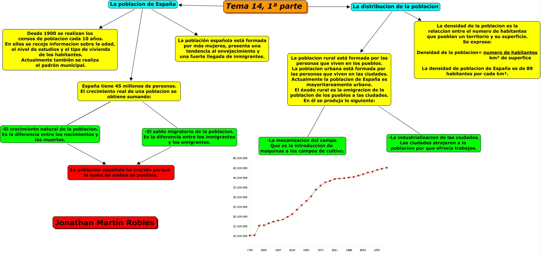 Este Cmap, tiene información relacionada con: Tema 14 de cono 1º parte de Jonathan, España tiene 45 millones de personas. El crecimiento real de una poblacion se obtiene sumando: -El saldo migratorio de la poblacion. Es la diferencia entre los inmigrantes y los emigrantes. La poblacion española ha crecido porque la suma de ambos es positiva., Tema 14, 1ª parte La distribucion de la poblacion La poblacion rural está formada por las personas que viven en los pueblos. La poblacion urbana está formada por las personas que viven en las ciudades. Actualmente la poblacion de España es mayoritareamente urbana. El éxodo rural es la emigracion de la poblacion de los pueblos a las ciudades. En él se produjo lo siguiente:, La poblacion rural está formada por las personas que viven en los pueblos. La poblacion urbana está formada por las personas que viven en las ciudades. Actualmente la poblacion de España es mayoritareamente urbana. El éxodo rural es la emigracion de la poblacion de los pueblos a las ciudades. En él se produjo lo siguiente: -La mecanizacion del campo. Que es la introduccion de maquinas a los campos de cultivo., España tiene 45 millones de personas. El crecimiento real de una poblacion se obtiene sumando: -El crecimiento natural de la poblacion. Es la diferencia entre los nacimientos y las muertes. La poblacion española ha crecido porque la suma de ambos es positiva., Tema 14, 1ª parte La poblacion de España España tiene 45 millones de personas. El crecimiento real de una poblacion se obtiene sumando:, Tema 14, 1ª parte La poblacion de España La población española está formada por más mujeres, presenta una tendencia al envejecimiento y una fuerte llegada de inmigrantes., La poblacion rural está formada por las personas que viven en los pueblos. La poblacion urbana está formada por las personas que viven en las ciudades. Actualmente la poblacion de España es mayoritareamente urbana. El éxodo rural es la emigracion de la poblacion de los pueblos a las ciudades. En él se produjo lo siguiente: -La industrializacion de las ciudades. Las ciudades atrajeron a la poblacion por que ofrecía trabajos., España tiene 45 millones de personas. El crecimiento real de una poblacion se obtiene sumando: -El crecimiento natural de la poblacion. Es la diferencia entre los nacimientos y las muertes. La poblacion española ha crecido porque la suma de ambos es positiva., Tema 14, 1ª parte La poblacion de España Desde 1900 se realizan los censos de poblacion cada 10 años. En ellos se recoje informacion sobre la edad, el nivel de estudios y el tipo de vivienda de los habitantes. Actualmente también se realiza el padrón municipal., Tema 14, 1ª parte La distribucion de la poblacion La densidad de la poblacion es la relaccion entre el numero de habitantes que pueblan un territorio y su superficie. Se expresa: Densidad de la poblacion= numero de habitantes km² de superfice La densidad de poblacion de España es de 89 habitantes por cada km².