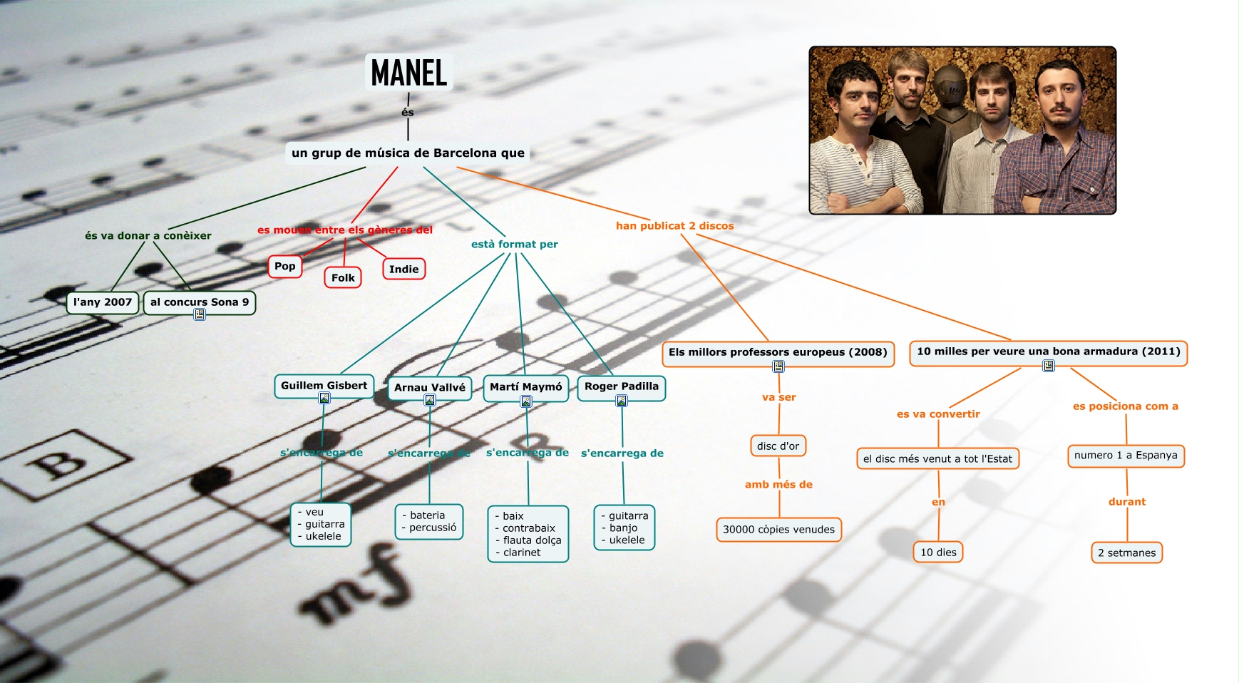 Aquest mapa conceptual conté informació relacionada amb: Fenomen Manel, el disc més venut a tot l'Estat en 10 dies, numero 1 a Espanya durant 2 setmanes, MANEL és un grup de música de Barcelona que, un grup de música de Barcelona que es mouen entre els gèneres del Folk, un grup de música de Barcelona que està format per Guillem Gisbert, 10 milles per veure una bona armadura (2011) es posiciona com a numero 1 a Espanya, un grup de música de Barcelona que és va donar a conèixer al concurs Sona 9, un grup de música de Barcelona que és va donar a conèixer l'any 2007, un grup de música de Barcelona que està format per Roger Padilla, Martí Maymó s'encarrega de - baix - contrabaix - flauta dolça - clarinet, un grup de música de Barcelona que es mouen entre els gèneres del Pop, un grup de música de Barcelona que està format per Arnau Vallvé, Els millors professors europeus (2008) va ser disc d'or, un grup de música de Barcelona que han publicat 2 discos Els millors professors europeus (2008), Guillem Gisbert s'encarrega de - veu - guitarra - ukelele, un grup de música de Barcelona que han publicat 2 discos 10 milles per veure una bona armadura (2011), Roger Padilla s'encarrega de - guitarra - banjo - ukelele, Arnau Vallvé s'encarrega de - bateria - percussió, un grup de música de Barcelona que es mouen entre els gèneres del Indie, disc d'or amb més de 30000 còpies venudes