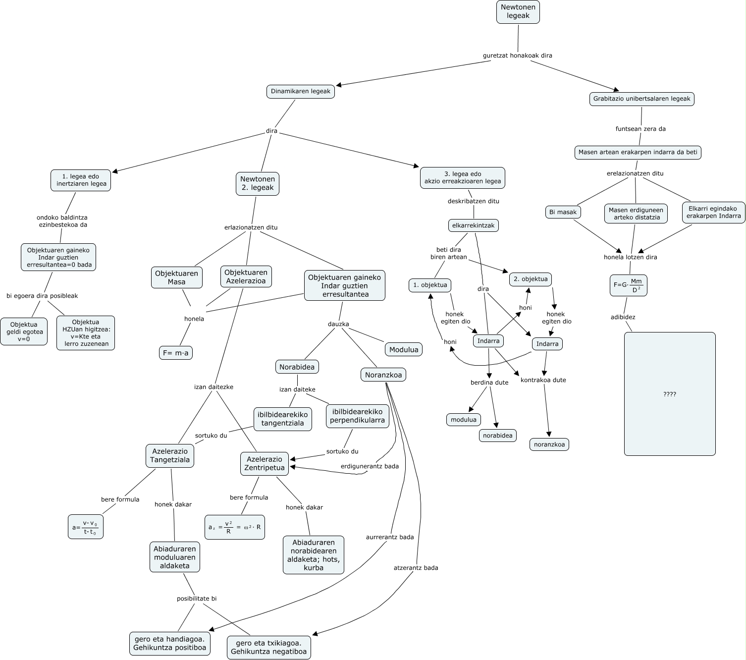 Este Cmap, tiene información relacionada con: Newtonen Lege guztiak, Bi masak honela lotzen dira <math xmlns="http://www.w3.org/1998/Math/MathML"> <mrow> <mtext> F=G· </mtext> <mfrac> <mtext> Mm </mtext> <mmultiscripts> <mtext> D </mtext> <none/> <mtext> 2 </mtext> </mmultiscripts> </mfrac> </mrow> </math>, Abiaduraren moduluaren aldaketa posibilitate bi gero eta txikiagoa. Gehikuntza negatiboa, Dinamikaren legeak dira Newtonen 2. legeak, Indarra kontrakoa dute noranzkoa, Norabidea izan daiteke ibilbidearekiko tangentziala, Dinamikaren legeak dira 3. legea edo akzio erreakzioaren legea, Grabitazio unibertsalaren legeak funtsean zera da Masen artean erakarpen indarra da beti, Indarra berdina dute norabidea, Indarra honi 2. objektua, Objektuaren Masa honela F= m·a, 1. legea edo inertziaren legea ondoko baldintza ezinbestekoa da Objektuaren gaineko Indar guztien erresultantea=0 bada, Noranzkoa atzerantz bada gero eta txikiagoa. Gehikuntza negatiboa, Newtonen 2. legeak erlazionatzen ditu Objektuaren gaineko Indar guztien erresultantea, Azelerazio Tangetziala honek dakar Abiaduraren moduluaren aldaketa, 2. objektua honek egiten dio Indarra, Norabidea izan daiteke ibilbidearekiko perpendikularra, Newtonen 2. legeak erlazionatzen ditu Objektuaren Azelerazioa, Objektuaren gaineko Indar guztien erresultantea honela F= m·a, Dinamikaren legeak dira 1. legea edo inertziaren legea, Objektuaren Azelerazioa izan daitezke Azelerazio Tangetziala